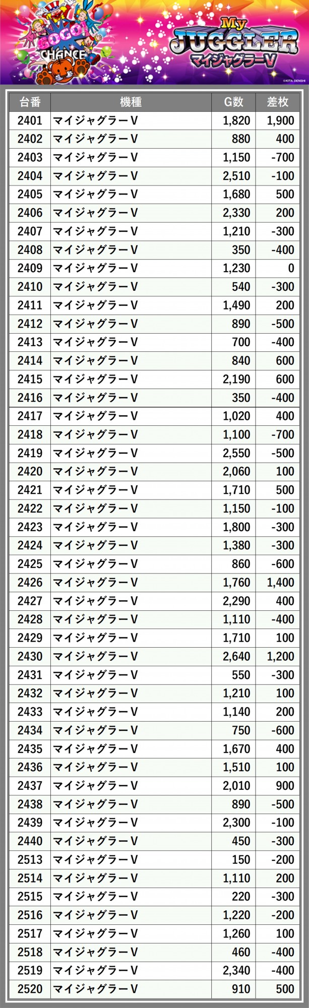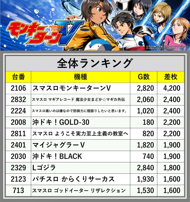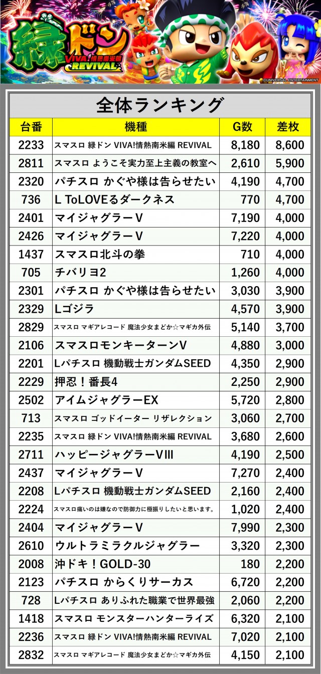 ※差枚数順に掲載しています