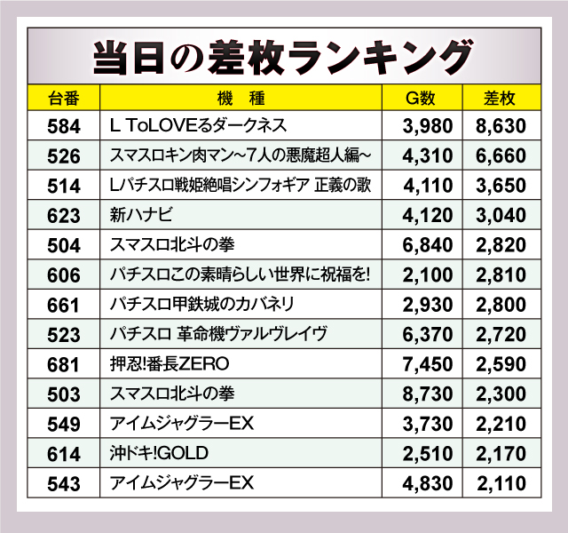 優秀台を見てみると、トップに立ったのは+8,630枚を記録した『L ToLOVEるダークネス』の584番台。G数を考えると、もっと稼働していれば大台突破も狙えたのではないかと思わせた。次いで+6,660枚の『スマスロキン肉マン〜7人の悪魔超人編〜』526番台。ファンの人気に応える出玉を披露してくれた。これに続いたのが+3,650枚の『Lパチスロ戦姫絶唱シンフォギア 正義の歌』514番台。こちらも安定感のあるところを見せた。以下、+3,040枚の『新ハナビ』623番台、+2,820枚の『スマスロ北斗の拳』504番台、+2,810枚の『パチスロこの素晴らしい世界に祝福を!』606番台、+2,800枚の『パチスロ甲鉄城のカバネリ』661番台と続いた。