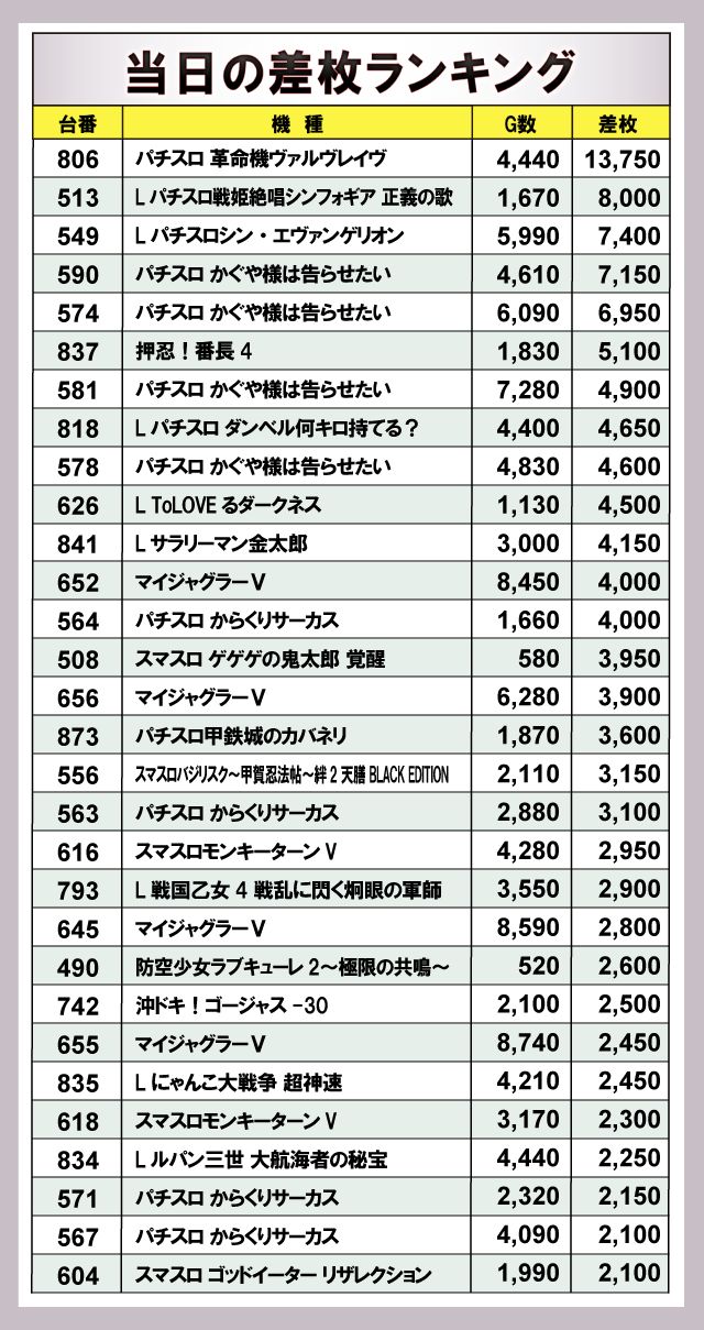 『パチスロ 革命機ヴァルヴレイヴ』から万枚OVERが発生。ほかにも『Lパチスロ戦姫絶唱シンフォギア 正義の歌』から+8,000枚OVER、『Lパチスロシン・エヴァンゲリオン』と『パチスロ かぐや様は告らせたい』から+7,000枚OVERが飛び出すなど、数多くの台がまとまった出玉を確保しており、店内は大きな熱気に包まれていたようだ。何よりも幅広い機種が名を連ねており、あらゆる機種にチャンスがあったと言えよう。