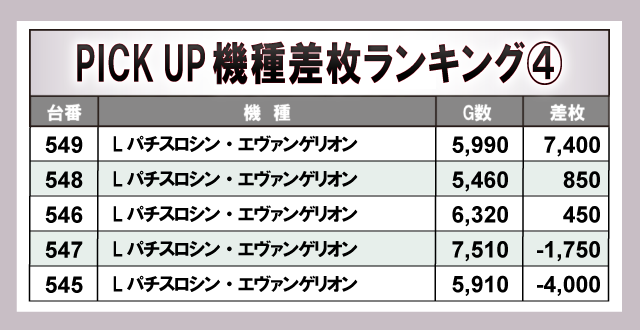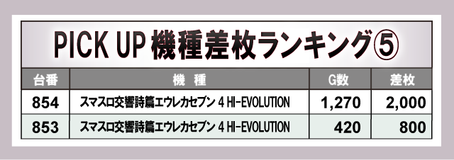 『マイジャグラーⅤ』は高い回転数とまとまった出玉を確保しており、優秀機種としてしっかりと活躍。『スマスロ交響詩篇エウレカセブン4 HI-EVOLUTION』では、全台プラス差枚数を達成するなど、相当なポテンシャルを秘めていたのは確かだ。遊技していたファンは充実のひと時を過ごしていたことだろう。