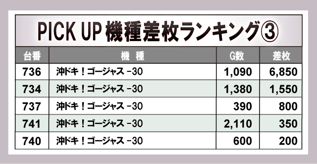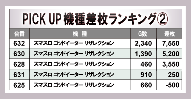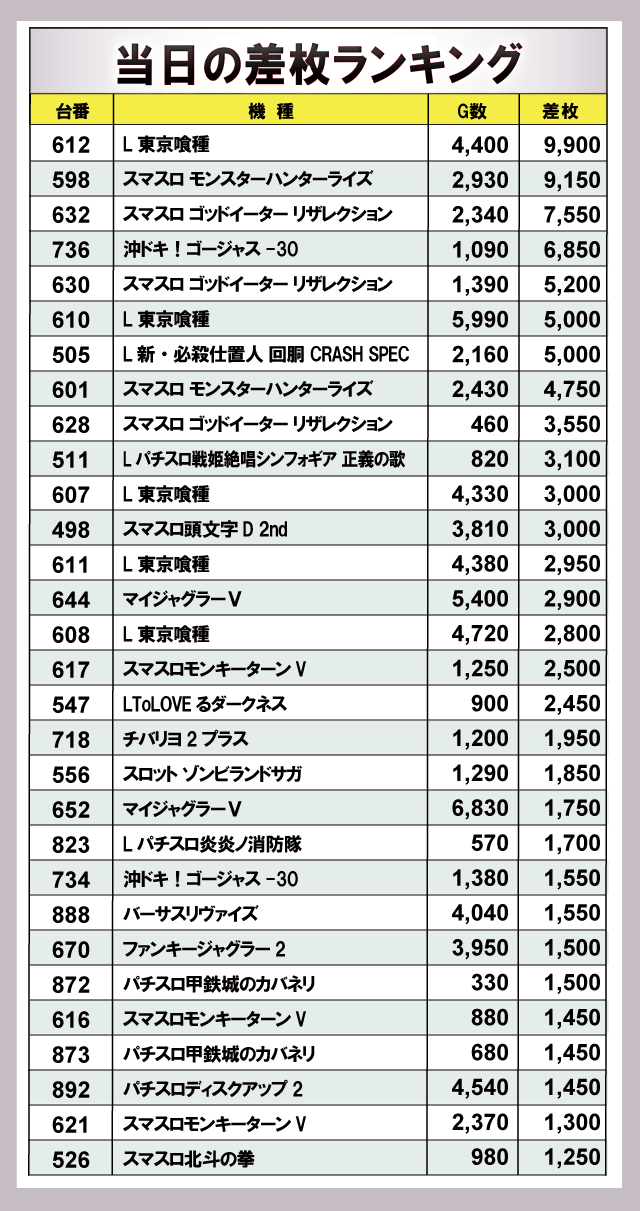 上表で取り上げている6機種は、いずれも大きな熱気を生み出している。中でも『スマスロ ゴッドイーター リザレクション』は8台中3台が3,000枚OVERと好成績を収めており、これらの機種たちが当日の盛り上がりを牽引していたのは間違いないだろう!