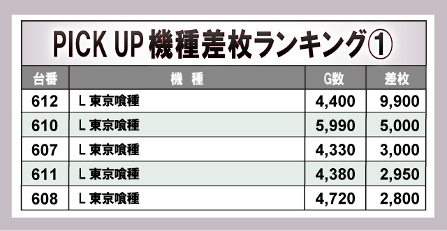 まずは当日の差枚ランキングを見てみよう。今回トップを飾ったのが『L 東京喰種』で+9,900枚をマーク!次点で『スマスロ モンスターハンターライズ』で+9,150枚を獲得した。万枚まであともう少しという状況だったが店内の盛り上がりに大きく貢献していた。他にもまとまった出玉を獲得する台が多く、遊技するファンは相当な手応えを掴んでいたことだろう。