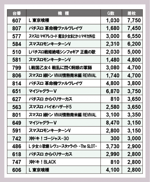 機種別差枚ランキング