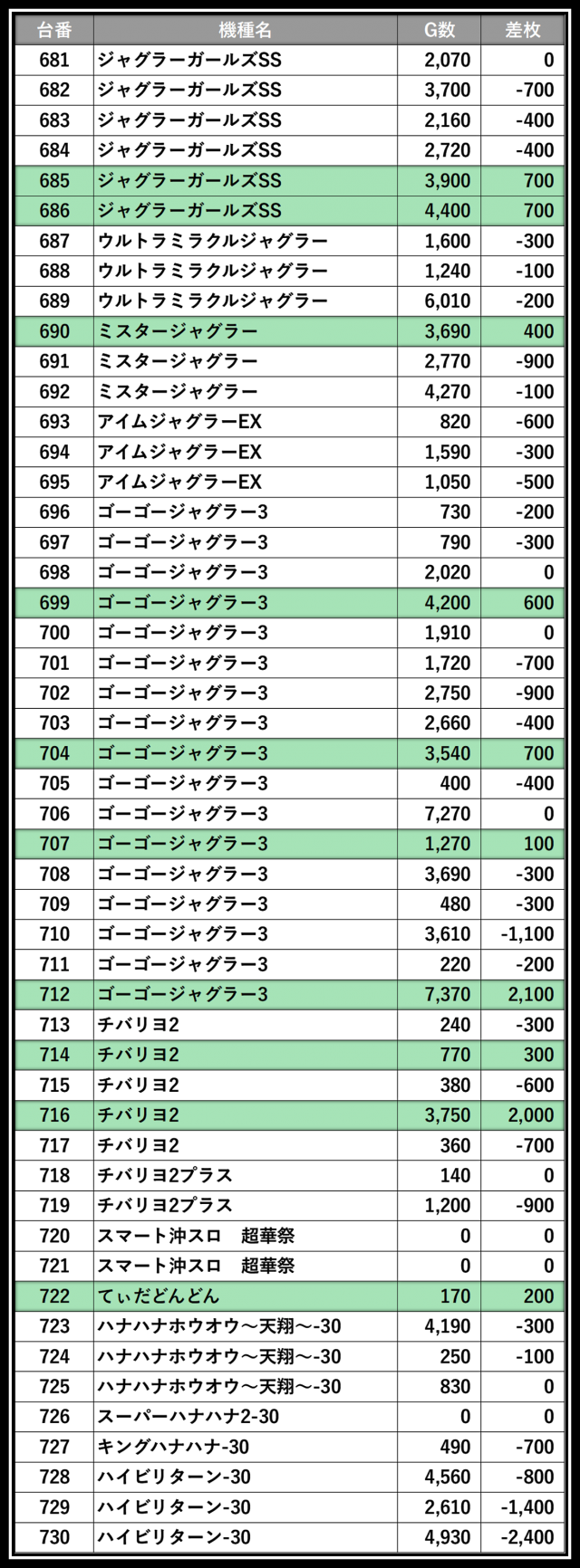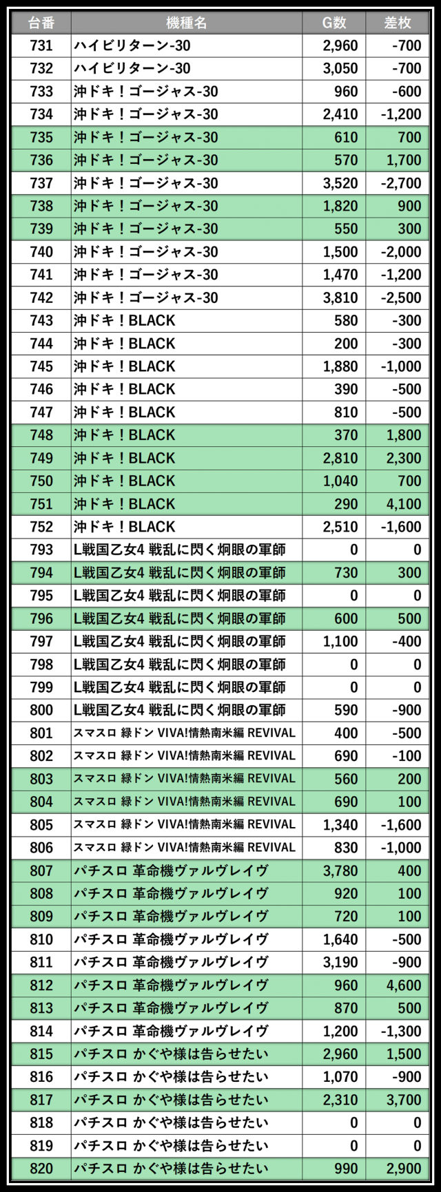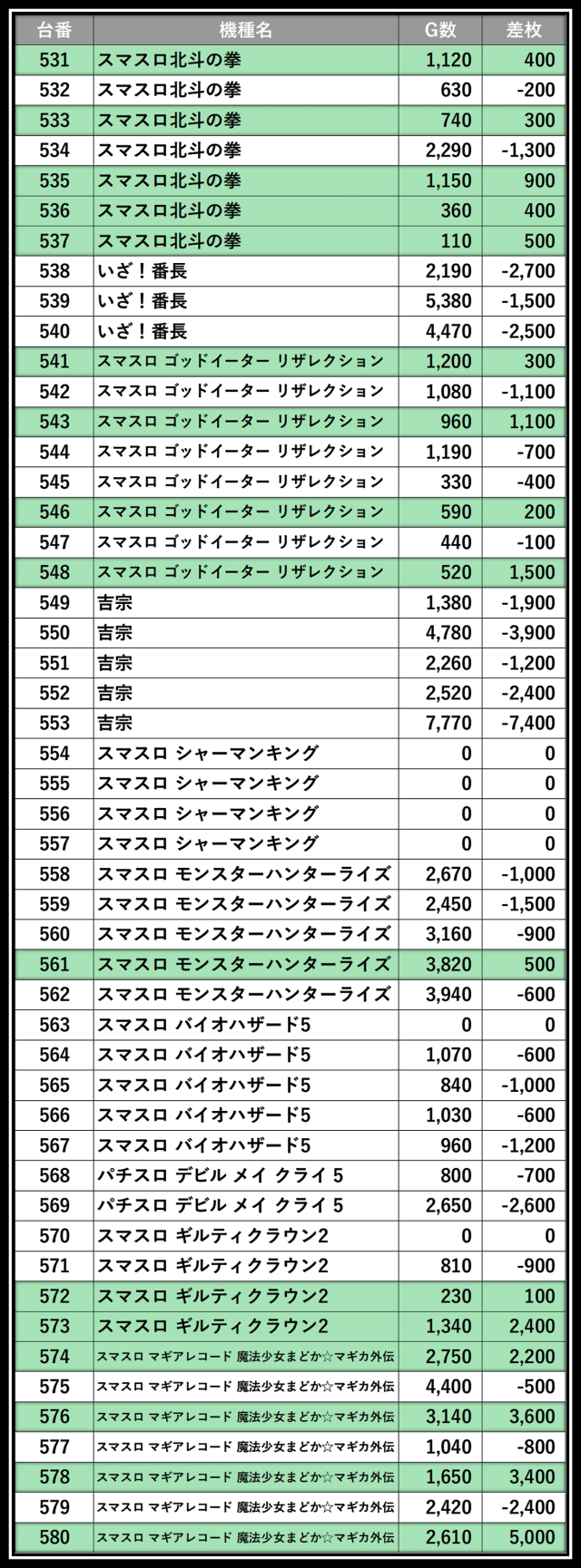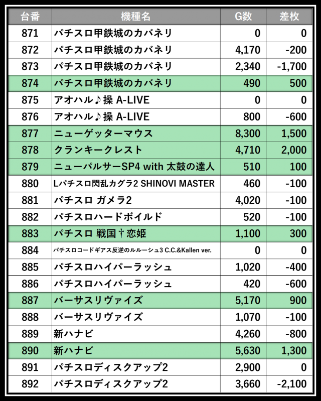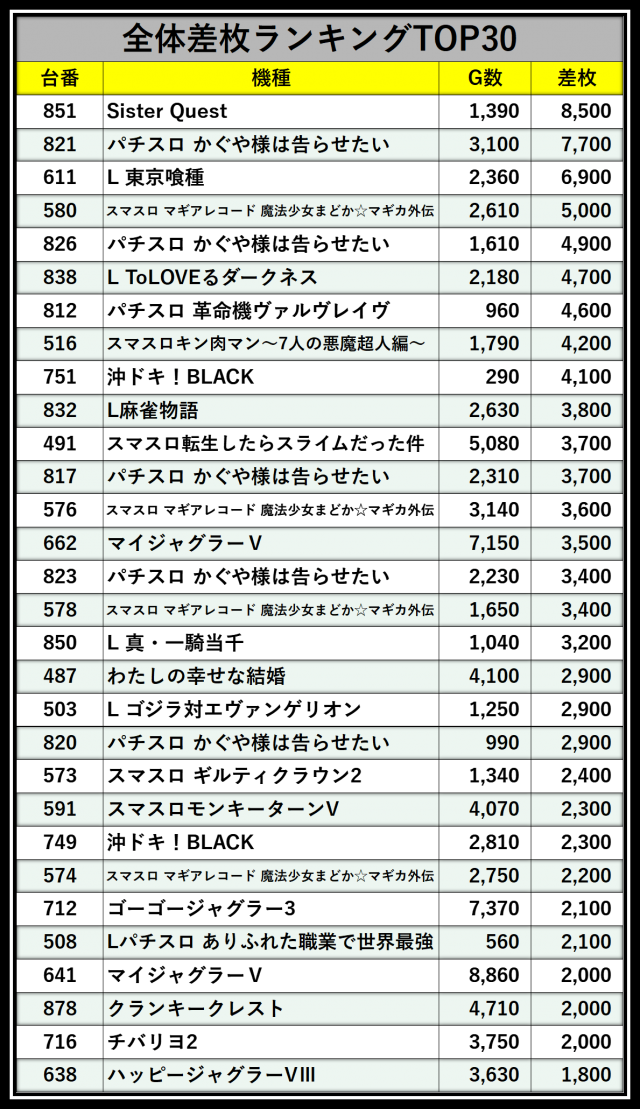 ※差枚数順に掲載しています