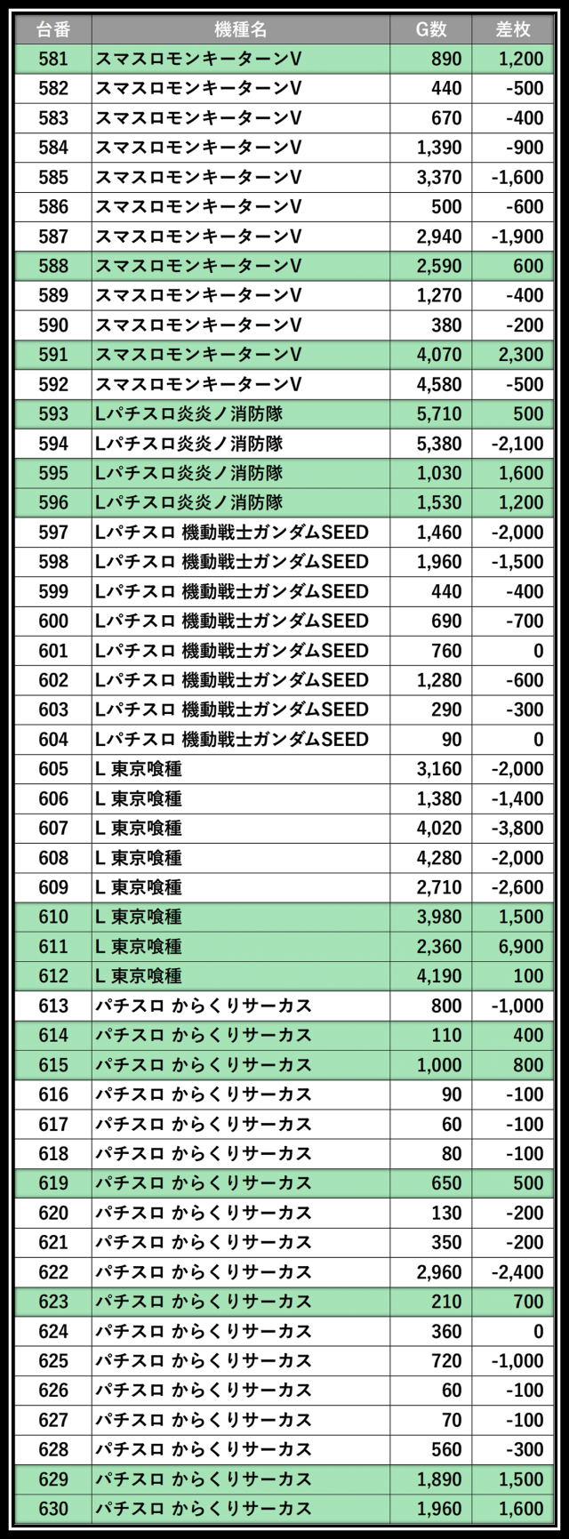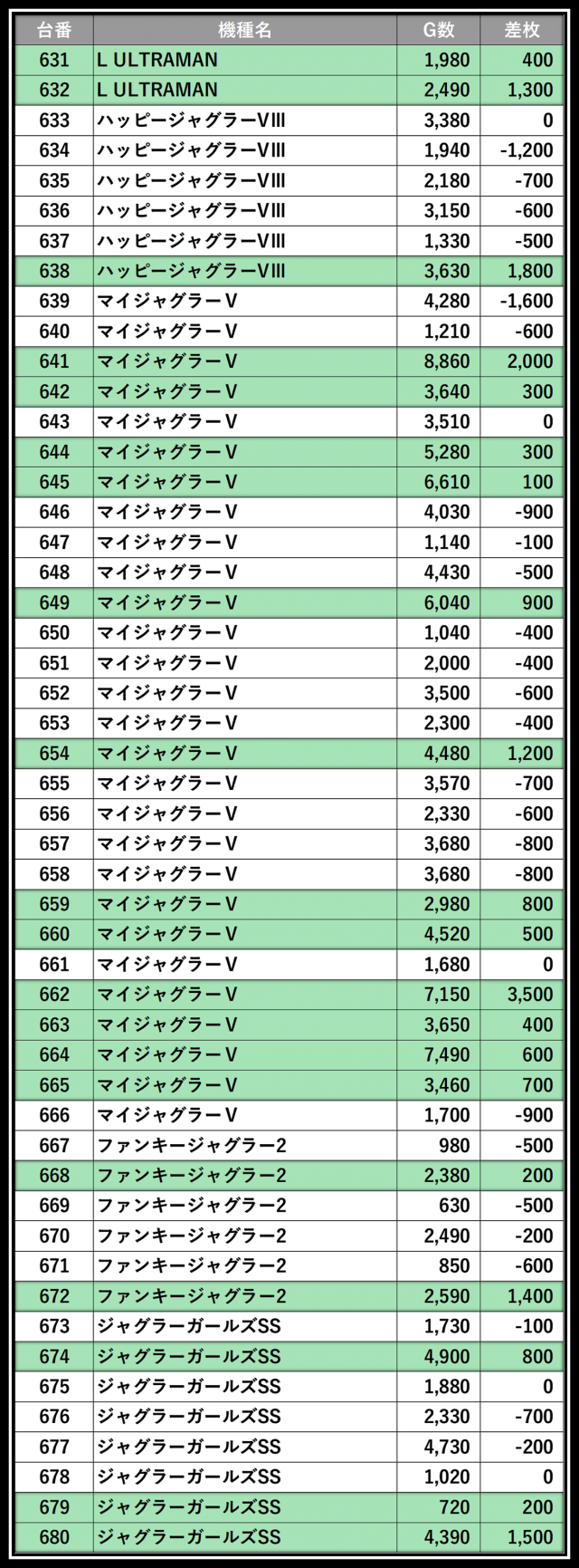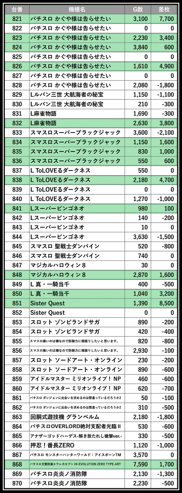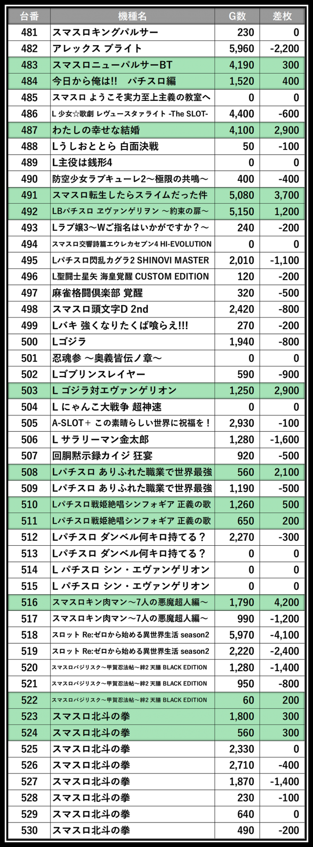※差枚数順に掲載しています