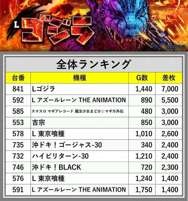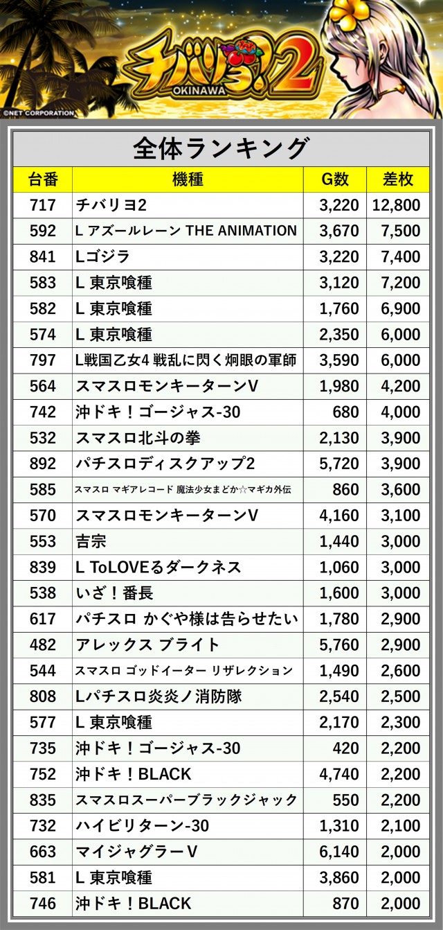 厳選された取材対象機種をはじめ、その他スロット全体から好記録が飛び出した!プレイヤーが楽しんだ1日を下記データにて振り返ってみて欲しい。