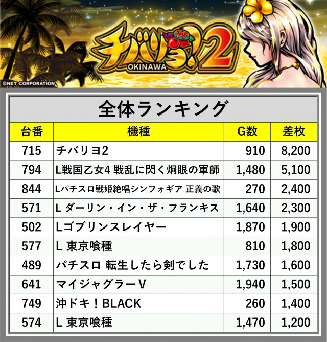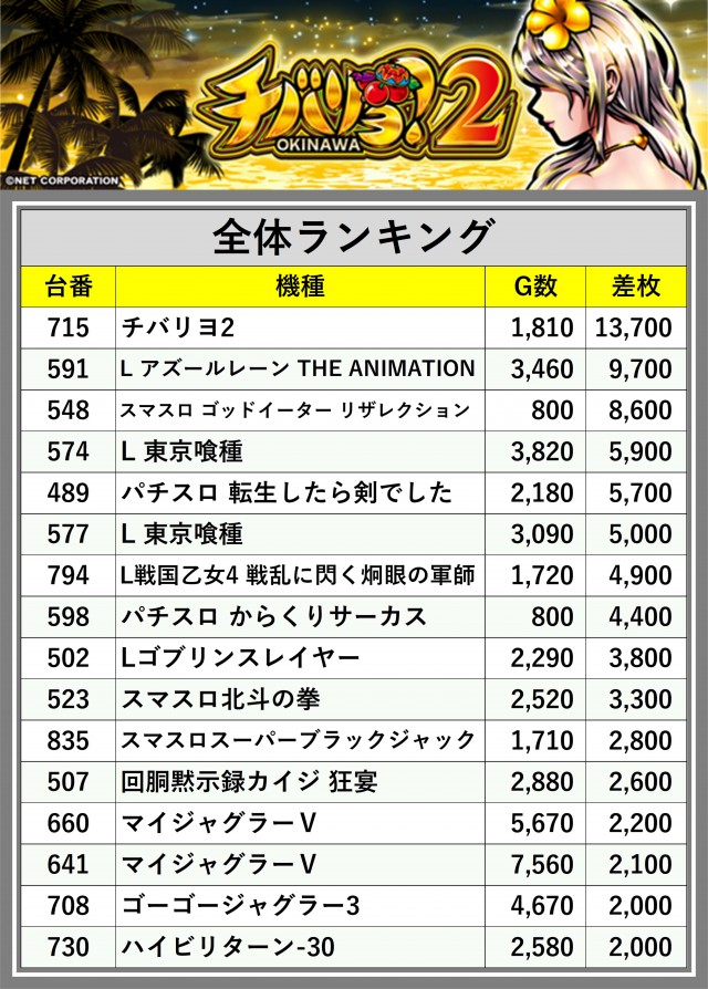 厳選された取材対象機種をはじめ、その他スロット全体から好記録が飛び出した!プレイヤーが楽しんだ1日を下記データにて振り返ってみて欲しい。