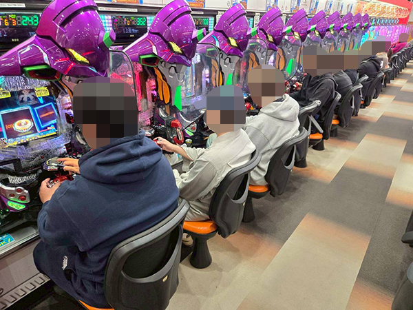 18時ごろの4円パチンコを見てみると「新世紀エヴァンゲリオン〜未来への咆哮〜」といったエヴァシリーズや、「e 東京喰種」などのラッキートリガー機が高稼働。プレイヤーの嬉しそうな表情を多数確認している。