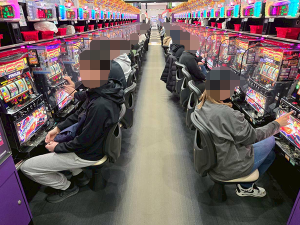 2.5円パチスロも人気で、空き台が見当たらないほどの盛況ぶりだった。