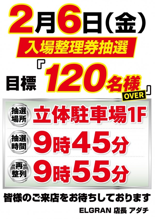 明日2月6日 朝10時開店【抽選目標120】