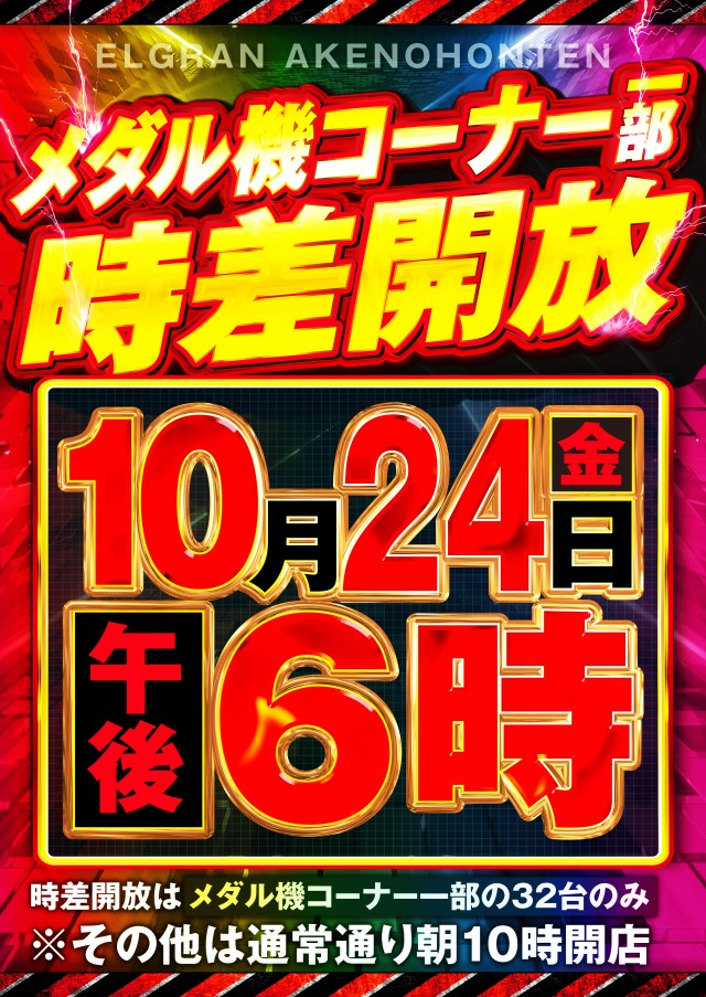 2025/10/24本日10月24日 メダル機一部時差開放 このあと午後6時より10月24日 メダル機一部 ★時差開放☆
