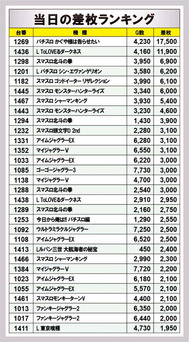 『パチスロ かぐや様は告らせたい』『L ToLOVEるダークネス』から万枚OVERが飛び出し、他にもスマスロ機を中心に大台突破台を多く確認できる。また、『ジャグラー』シリーズも多く名を連ねていることから、チャンスは各所に隠されていたようだ。