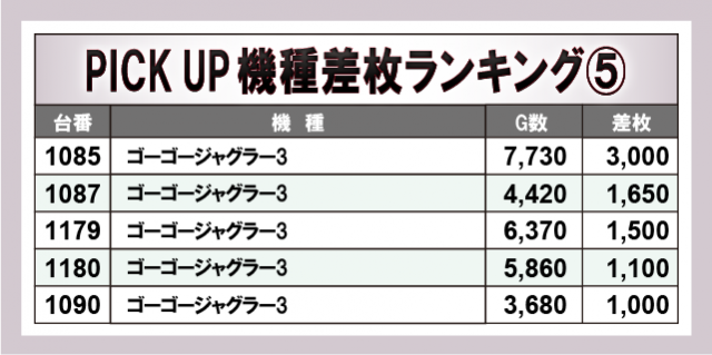 当日、特に盛り上がっていたのが上表の5機種だ。人気のスマスロ機を筆頭に叩きがいのある状況が整っており、凄まじい熱気が放たれていた。また、『アイムジャグラーEX』『ゴーゴージャグラー3』もコンスタントにプラス4桁OVERを生んでおり、ファンの期待に応えているのも特筆すべきポイントだろう。