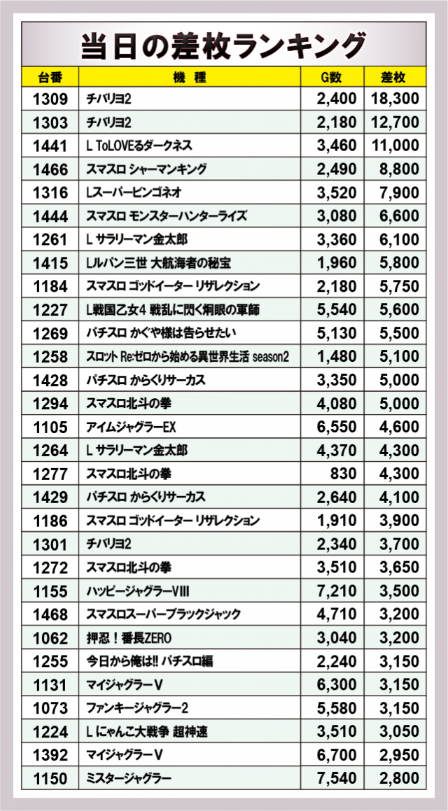 ※差枚数順に掲載しています。