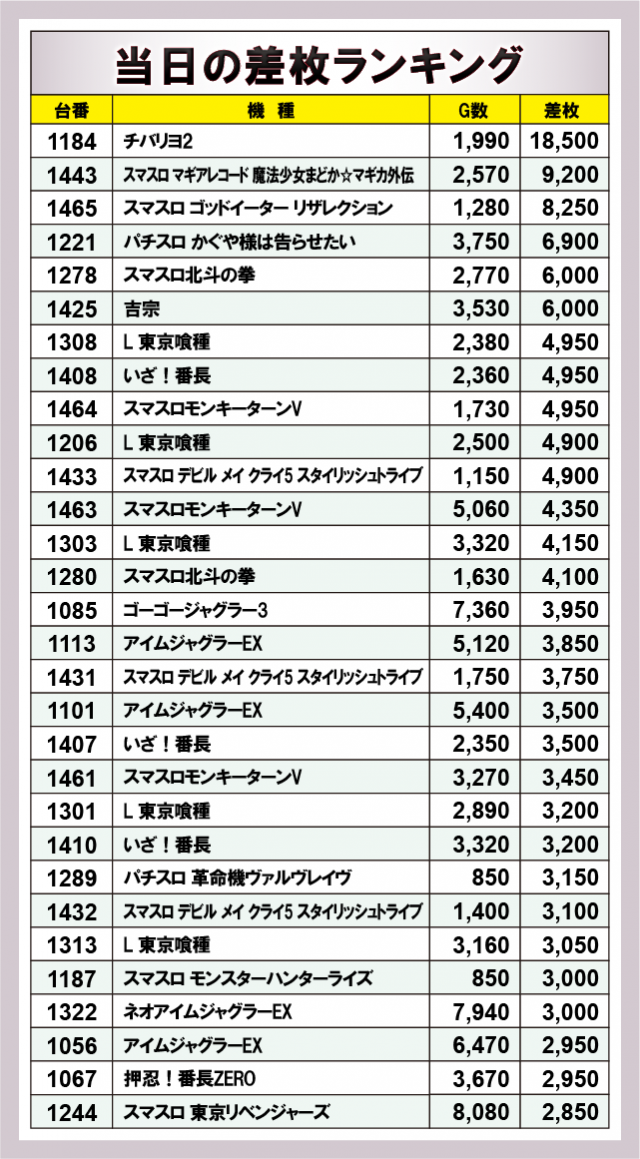 『チバリヨ2』から+18,500枚の圧巻記録が誕生し、コンプリート目前の勢いを見せつけた。さらに『スマスロ マギアレコード 魔法少女まどか☆マギカ外伝』や『スマスロ ゴッドイーター リザレクション』などでも万枚級の活躍が見られ、スマスロ機の爆発力が際立つ結果となった。加えて『ジャグラー』シリーズをはじめとしたノーマルタイプも安定感ある好調ぶりを示し、店内全体でバランスの取れた盛り上がりを見せていた。
