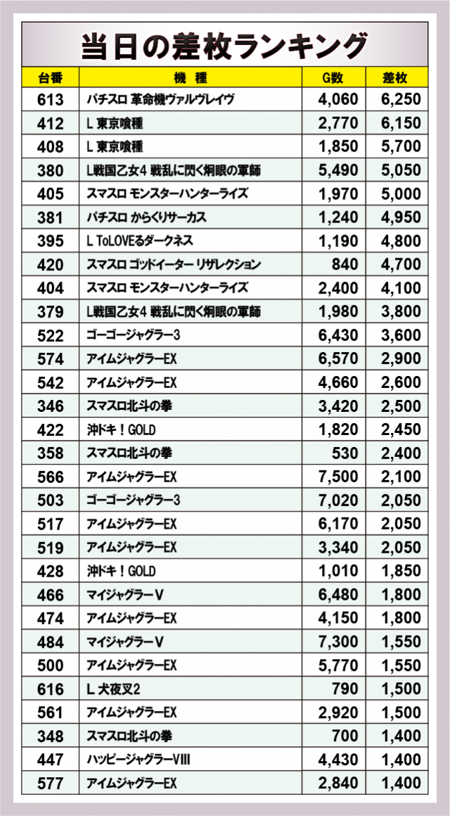 『パチスロ 革命機ヴァルヴレイヴ』『L 東京喰種』『L戦国乙女4 戦乱に閃く炯眼の軍師』『スマスロ モンスターハンターライズ』といったスマスロ人気機種から5~6000枚OVERをマークし、ホール内で注目の的となっていた。この他にもまとまった出玉を獲得する台が多数生まれており、各コーナーで打ちごたえのある展開に歓喜したファンも多かっただろう。