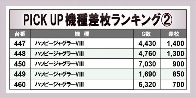 上表の優秀機種はプラス差枚数を多く築いており、ポテンシャルを秘めていた様子が窺える。その中でも『アイムジャグラーEX』はコンスタントに大当りを射止めていた様子が顕著で、2,000枚OVERが複数発生。GOGOランプの光が眩しく輝き、ファンの充実度とリンクしていたようだった。