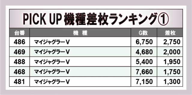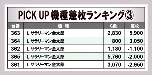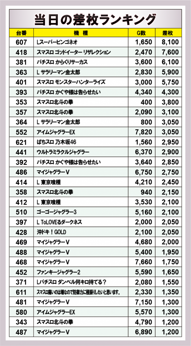 機種単位でみてみると『マイジャグラーⅤ』『Lスーパービンゴネオ』『L サラリーマン金太郎』の3機種で4桁プラス台が複数発生。スマスロ機からメダル機まで各所で打ちごたえのある状況が整っていた様子から、これらが館内の盛り上がりに大きく貢献していたと言えるだろう。