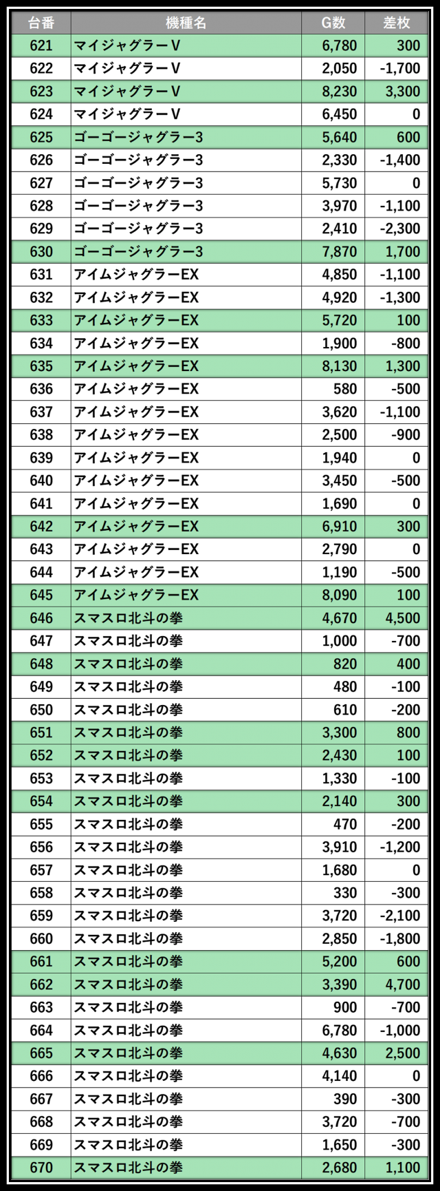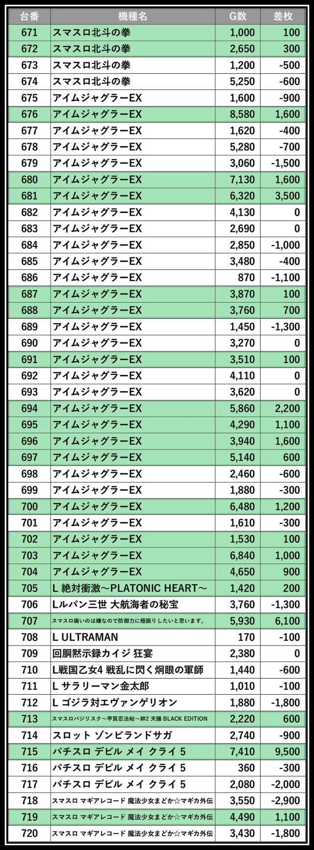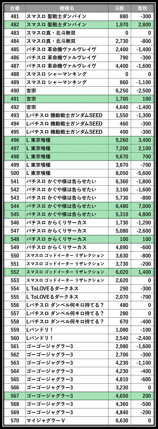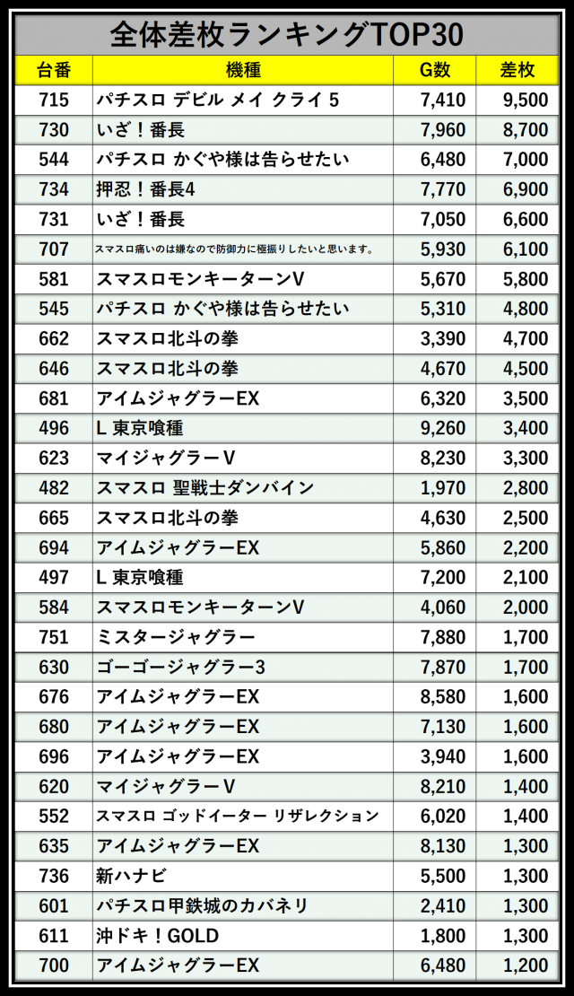 ※差枚数順に掲載しています
