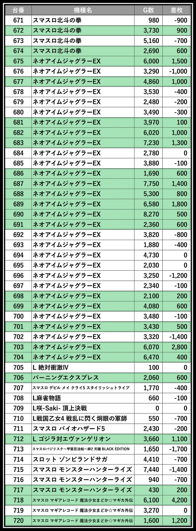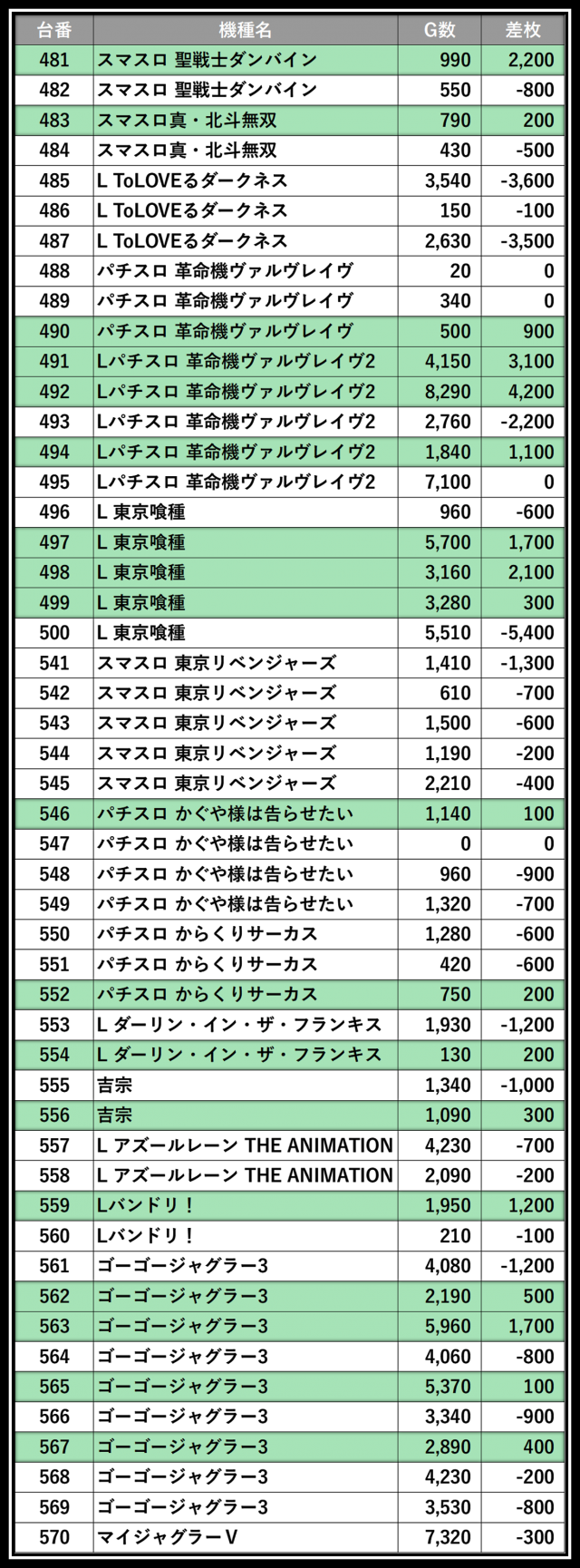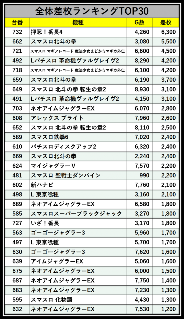 ※差枚数順に掲載しています