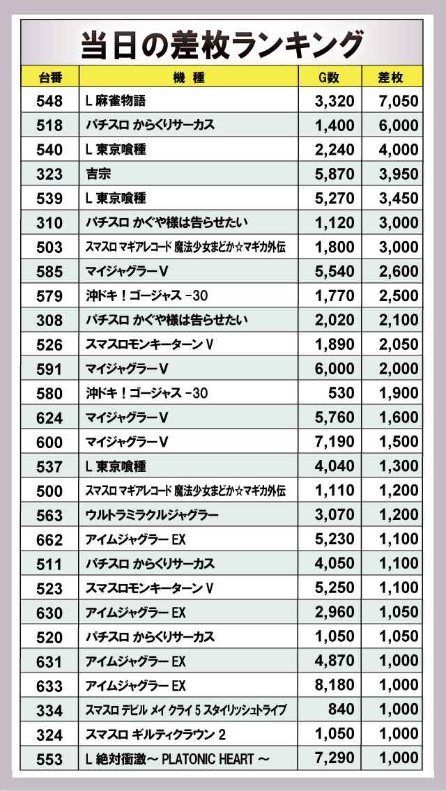 まずは当日の差枚ランキングを見てみよう。今回トップを飾ったのが『L麻雀物語』で+7,000枚OVERをマーク!次点で『パチスロ からくりサーカス』で+6,000枚を獲得し、店内の盛り上がりに大きく貢献していた。新台『L 絶対衝激~PLATONIC HEART~』もさっそく名を連ねており、幅広い機種にチャンスがあったと言えよう。