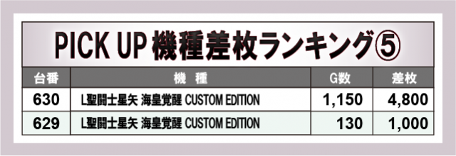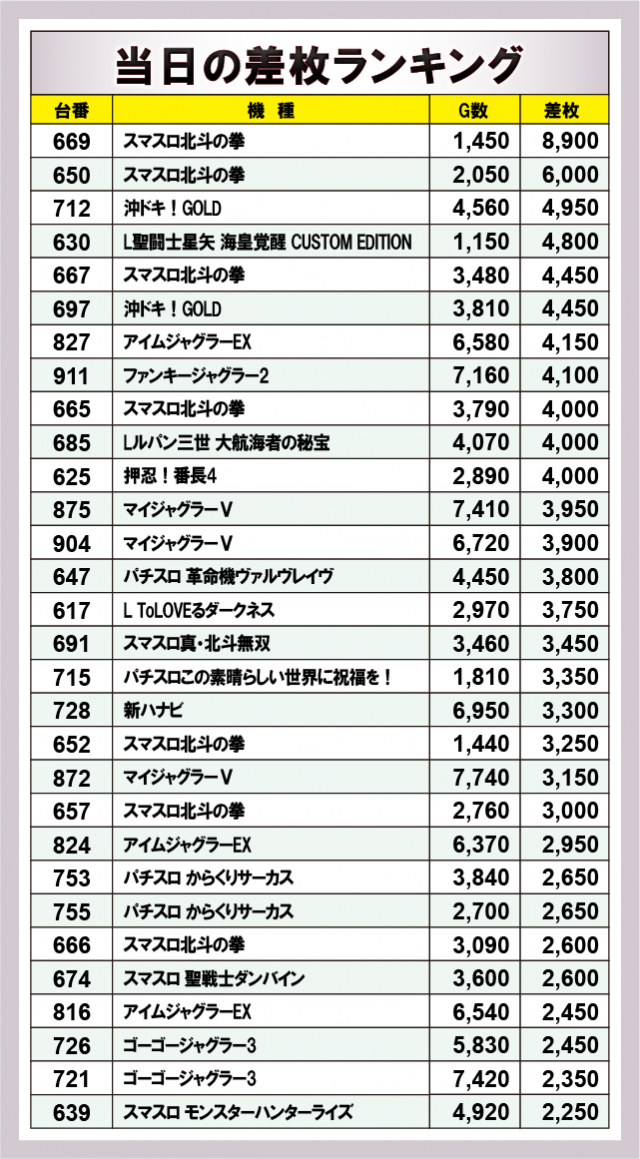 上表をご覧の通り、『スマスロ北斗の拳』から+8,900枚が発生し、当日の店内の盛り上がりをリード。また、スマスロ機の活躍だけでなく、メダル機もしっかりとランクインしており幅広い機種にチャンスがあったことが窺える。