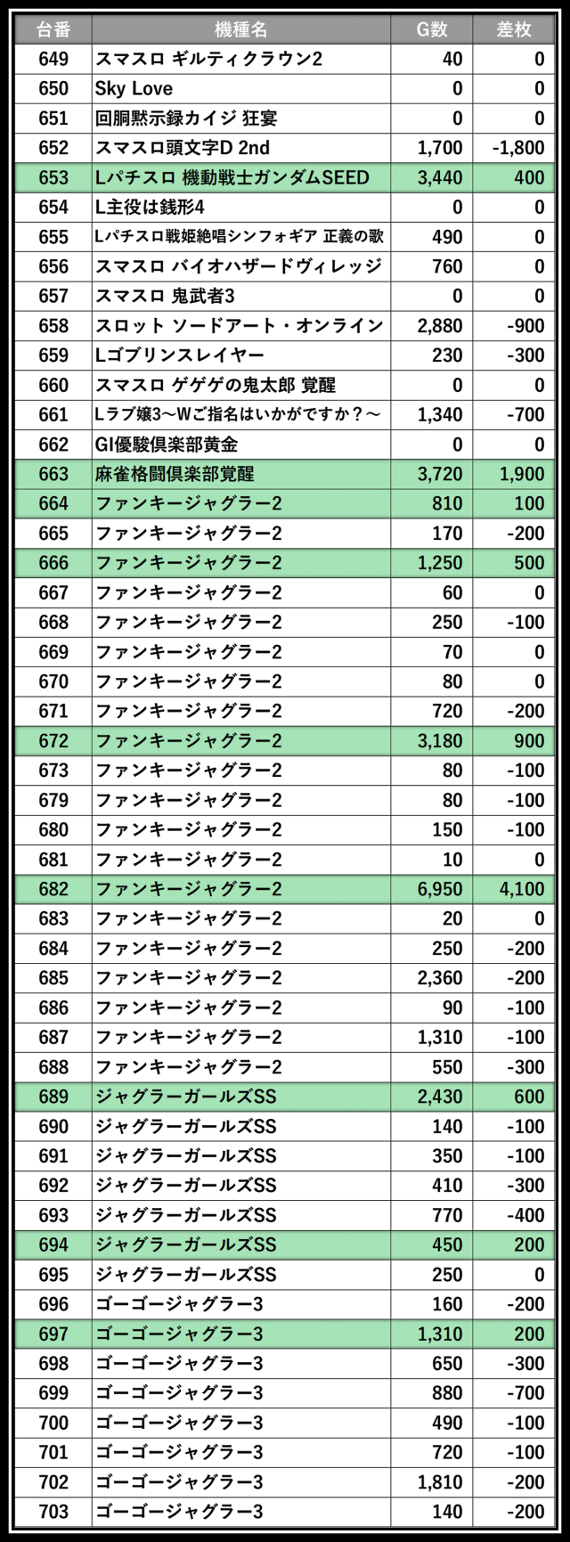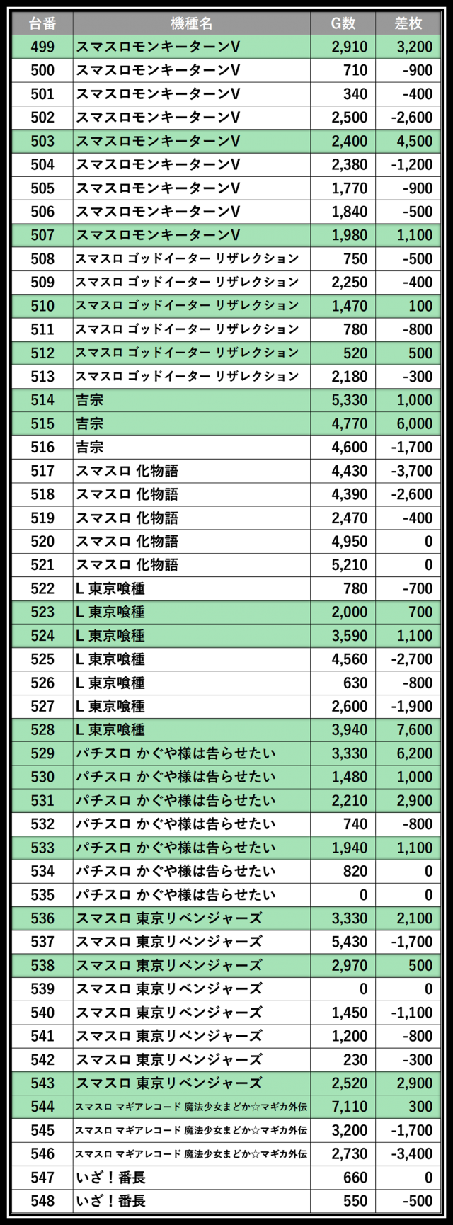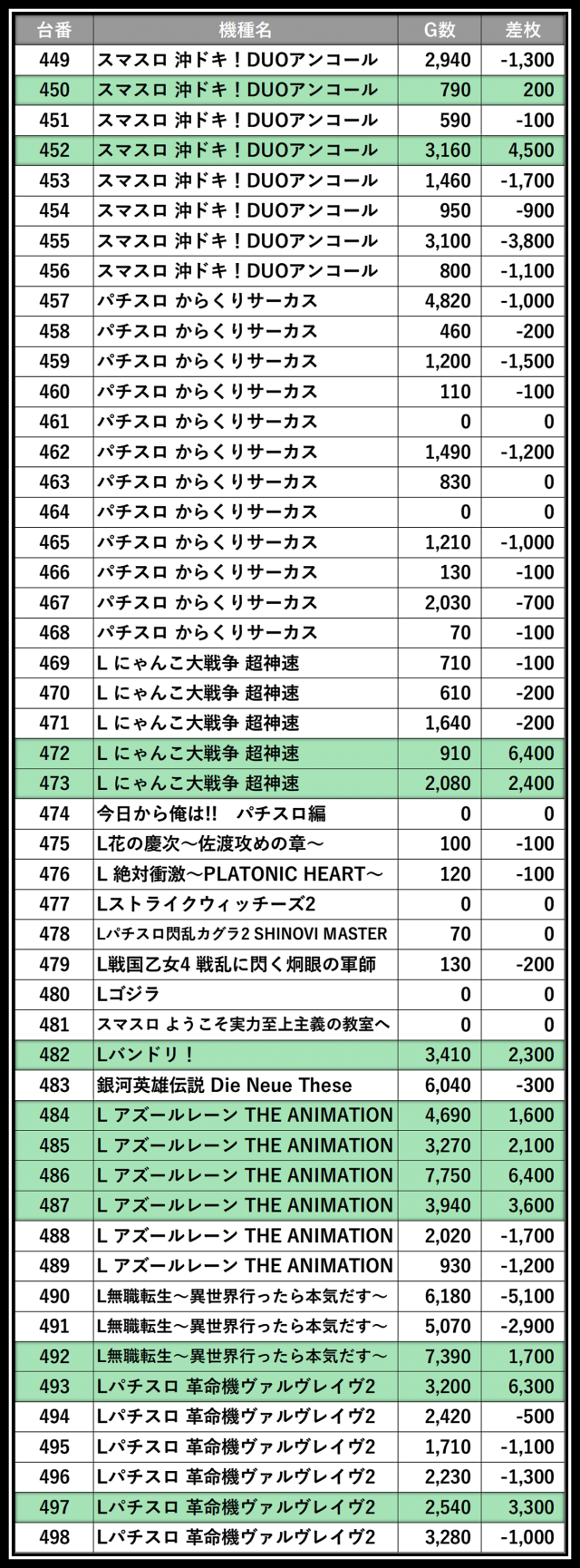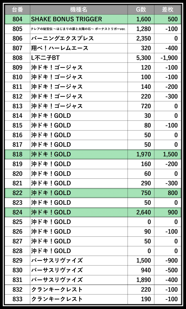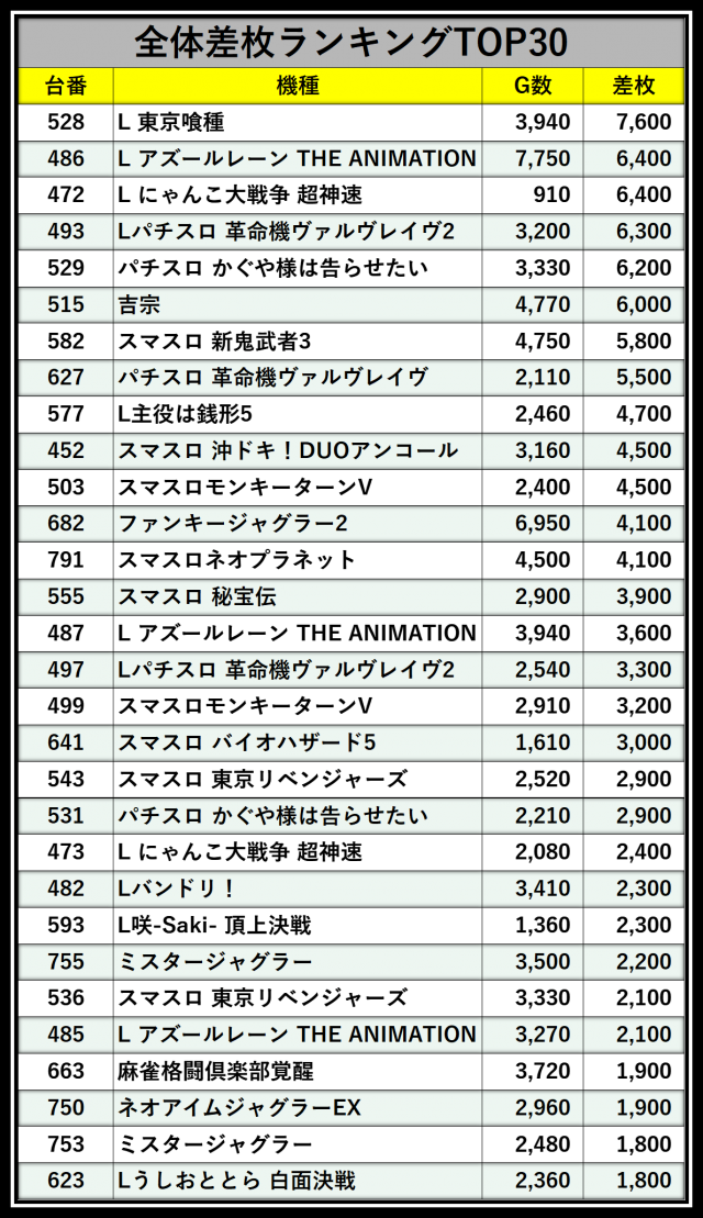 ※差枚数順に掲載しています