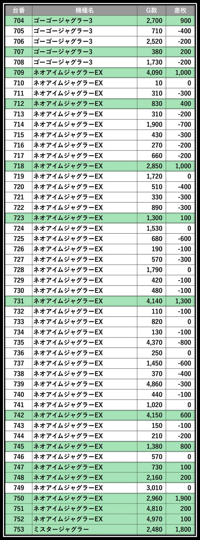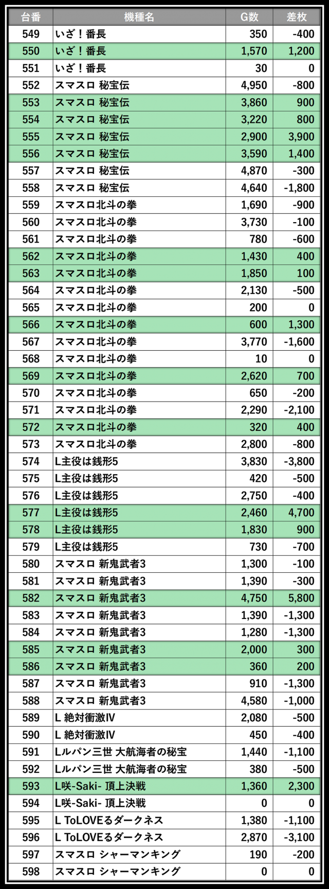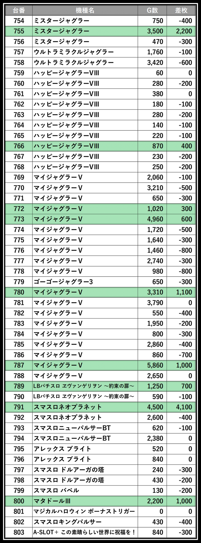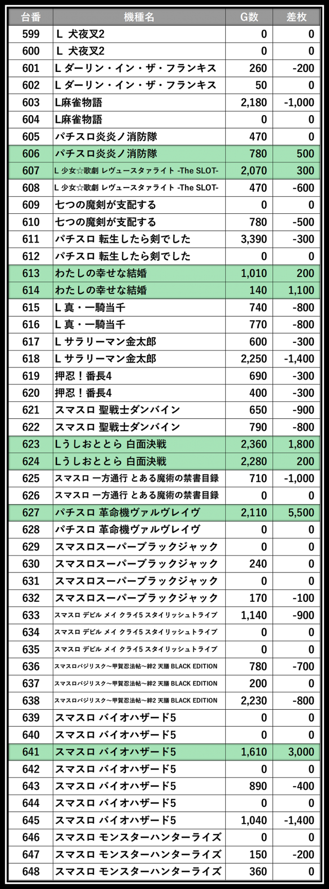 ※差枚数順に掲載しています
