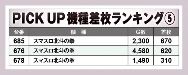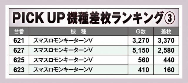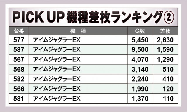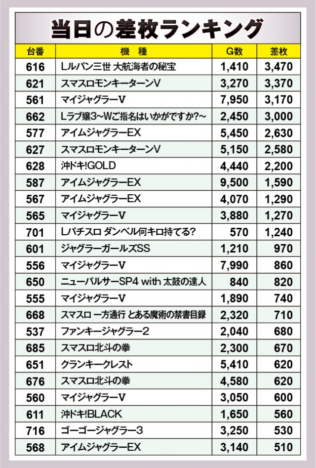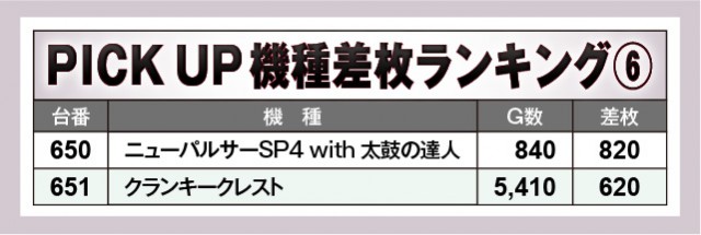 上表をご覧の通り、『マイジャグラーⅤ』や『アイムジャグラーEX』といったノーマル機を代表する機種が活躍していたのが鮮烈であるばかり。さらに『ニューパルサーSP4 with 太鼓の達人』『クランキークレスト』もポテンシャルを秘めており、じっくりと打ち込まれた形跡も見て取れる。もちろん『スマスロモンキーターンV』『沖ドキ!GOLD』もまとまりのある出玉を確保しており、優秀機種から熱気が放たれたという印象を受けるばかりだ。