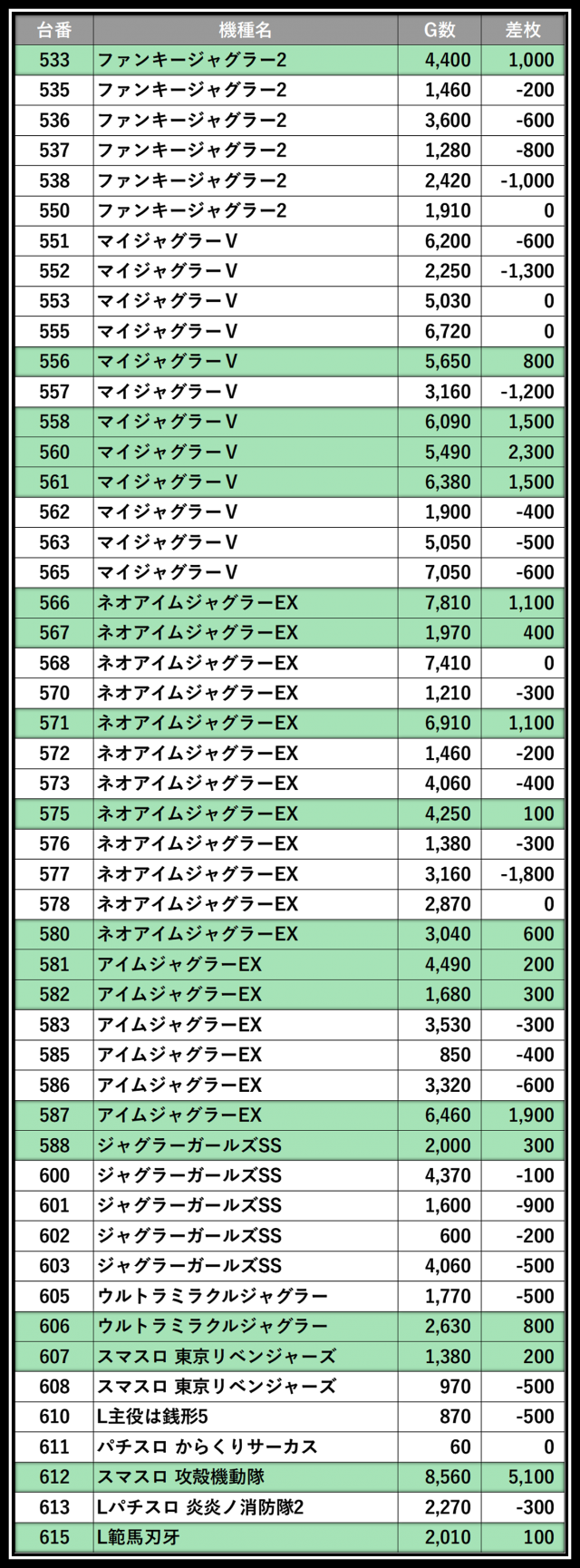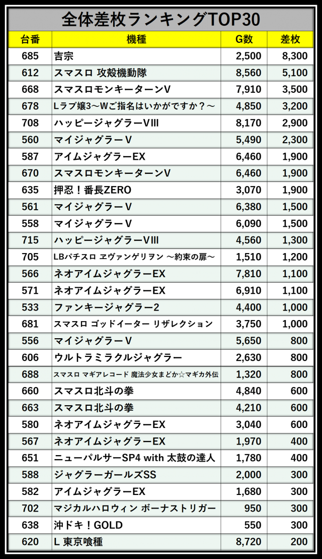※差枚数順に掲載しています
