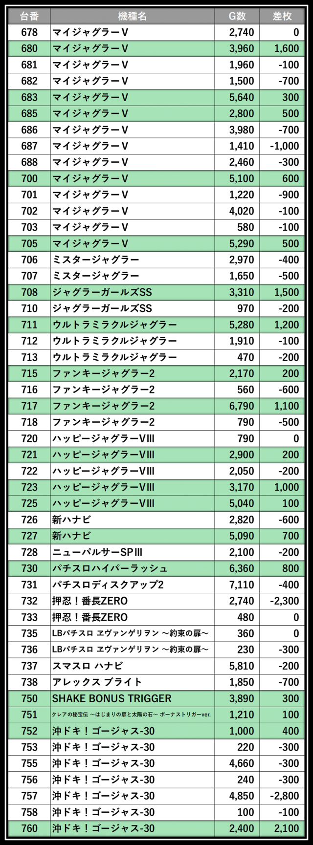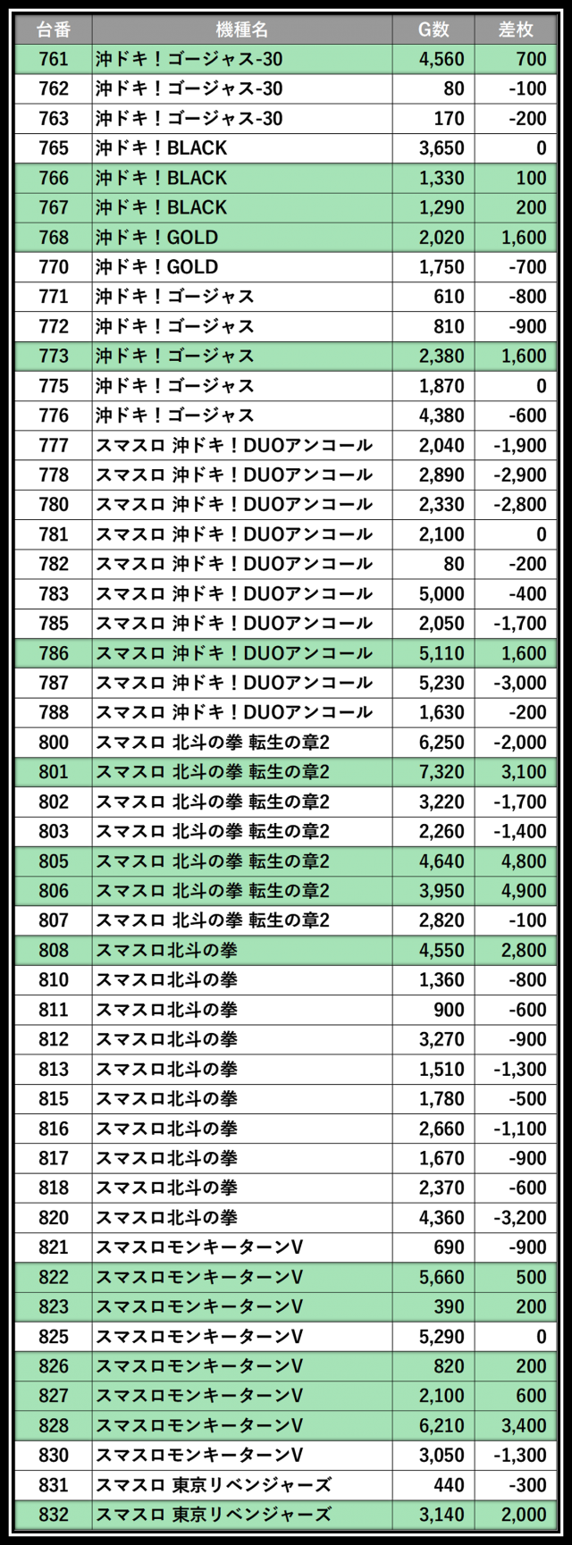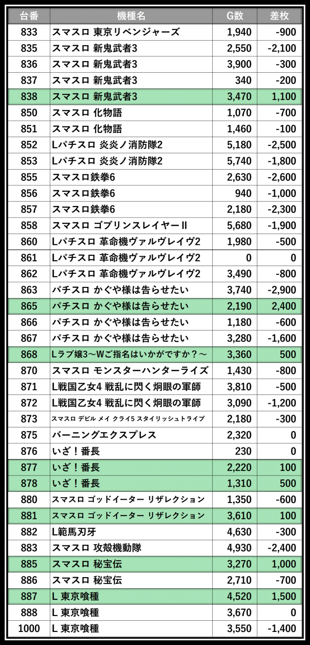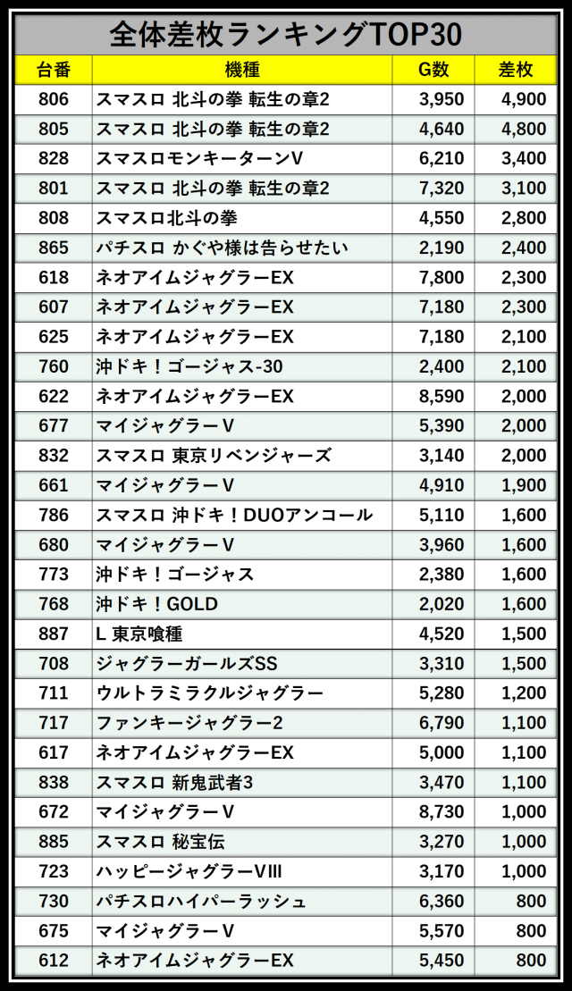 ※差枚数順に掲載しています