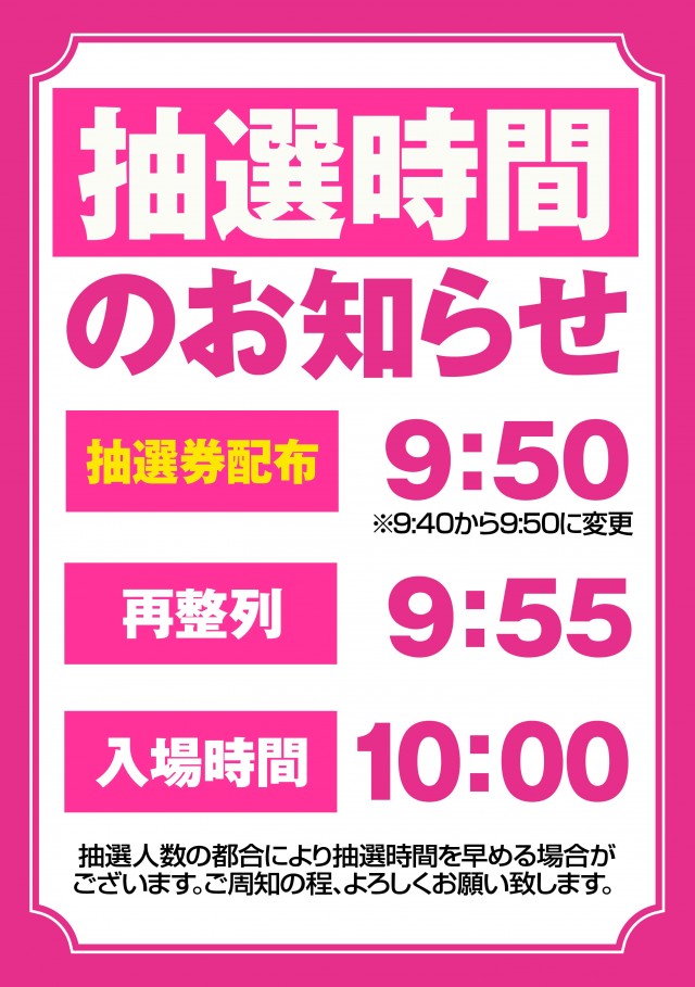 【午前9時50分⇒入場抽選会 午前9時55分⇒再整列 午前10時00分⇒入場開始】 優先入場をご希望されるお客様は午前9時40分までにお集まり下さい。 |