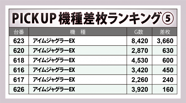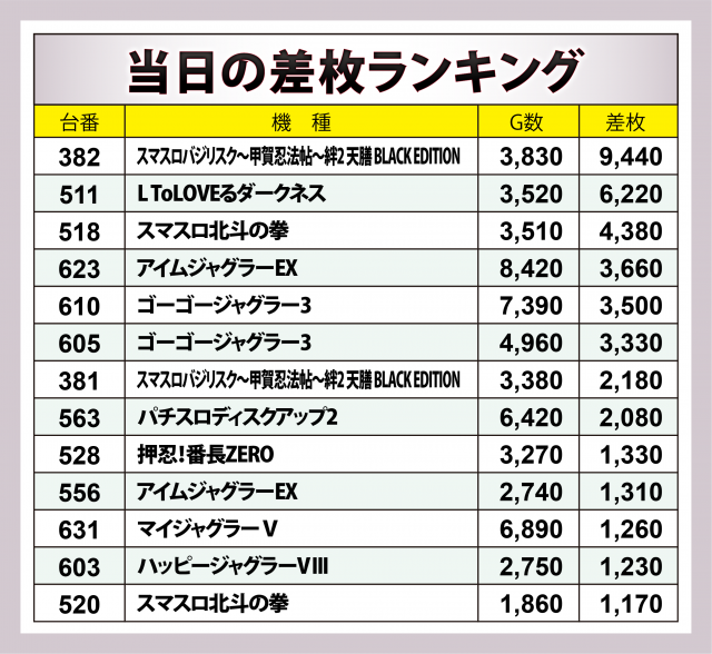 まずは上位13台を見ていこう。13台の全てが+1,000枚以上をマークし、+2,000枚以上は8台、+3,000枚オーバーは6台、+4,000枚オーバーは3台、+6,000枚オーバーは1台、+9,000枚オーバーは1台となった。