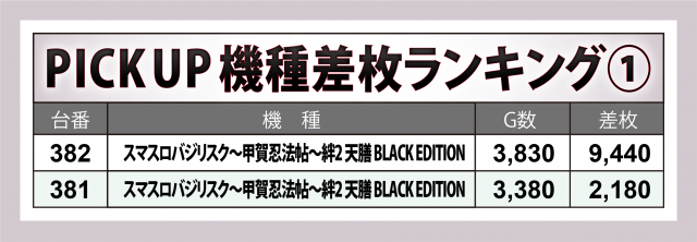 +9,400枚超の台を輩出し全108台の頂点に輝いた『スマスロバジリスク~甲賀忍法帖~絆2 天膳 BLACK EDITION』では他にも+2,200枚弱が1台あり。