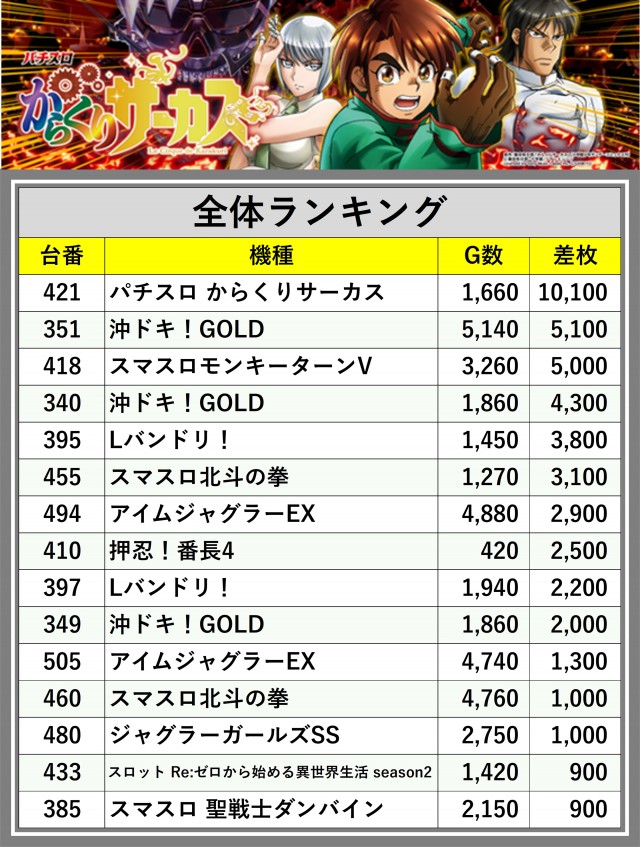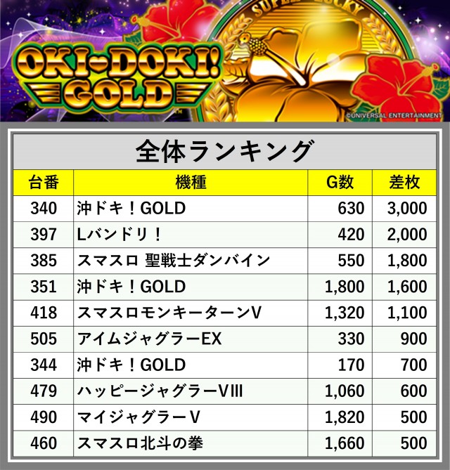 厳選された取材対象機種をはじめ、その他スロット全体から好記録が飛び出した!プレイヤーが楽しんだ1日を下記データにて振り返ってみて欲しい。