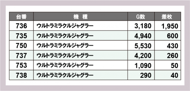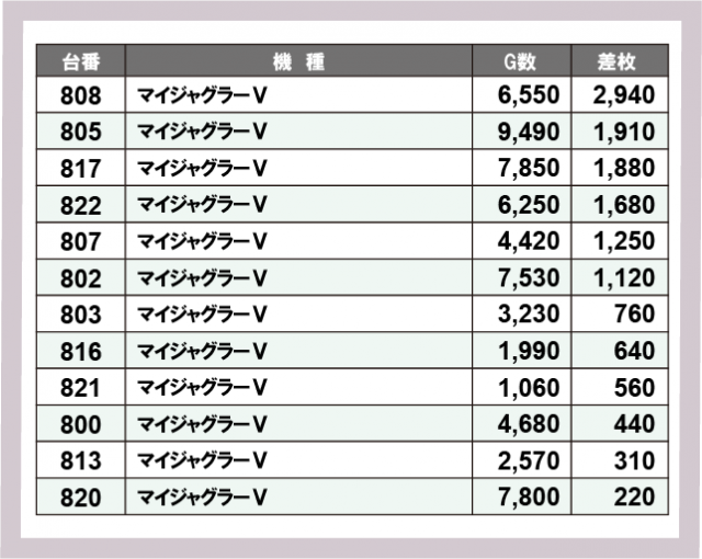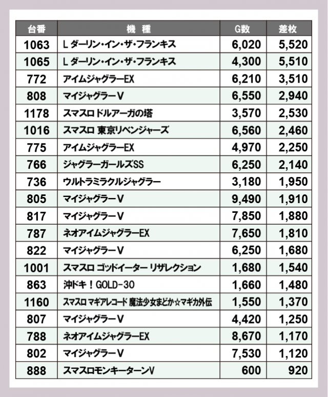 ※差枚数順に掲載しています