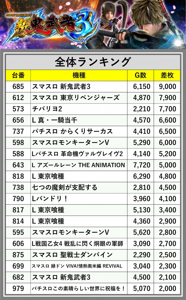 厳選された取材対象機種をはじめ、その他スロット全体から好記録が飛び出した!プレイヤーが楽しんだ1日を下記データにて振り返ってみて欲しい。