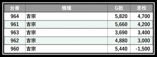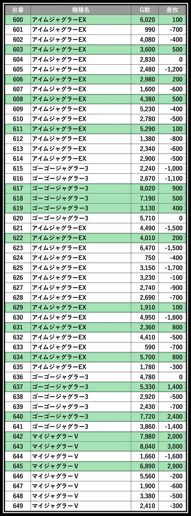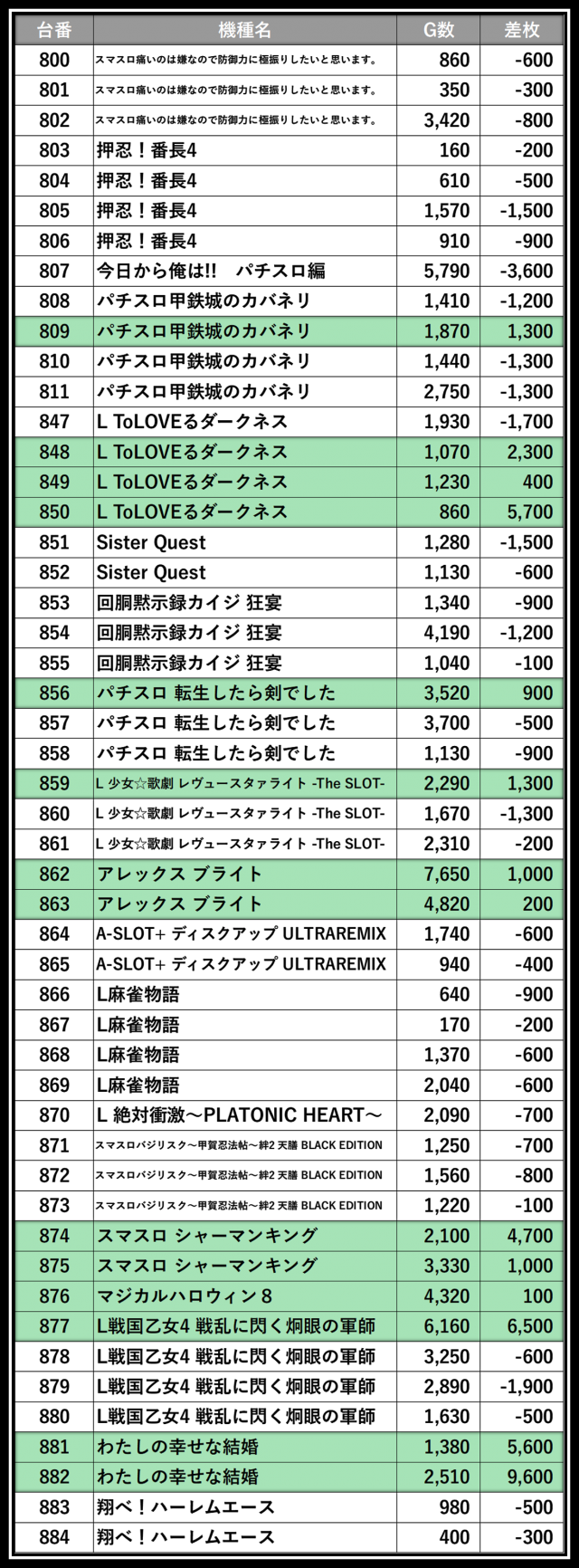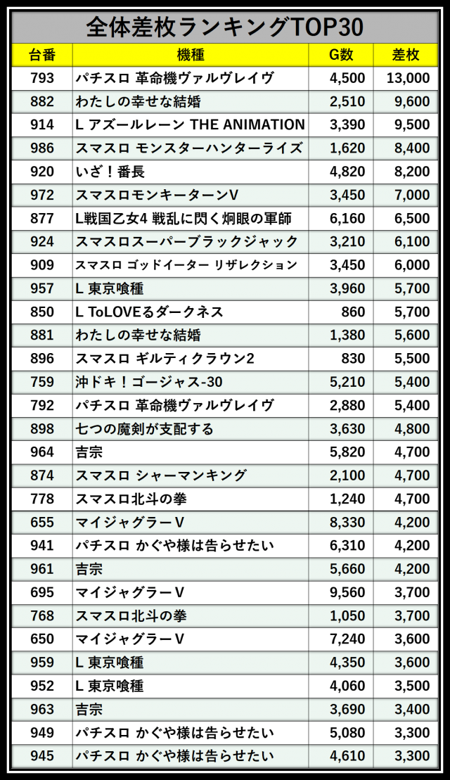 ※差枚数順に掲載しています