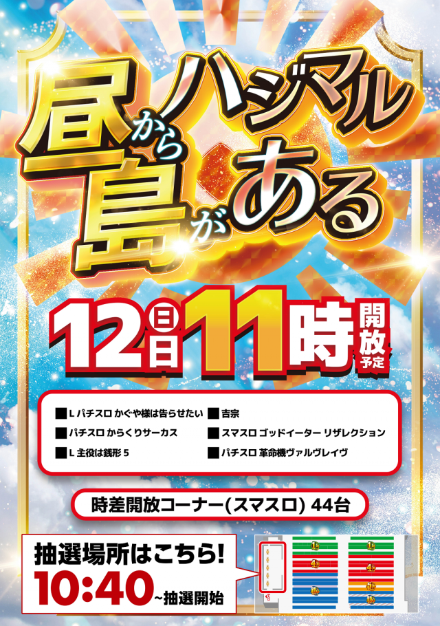 本日スロットコーナー一部時差解放!朝10時開店!!!