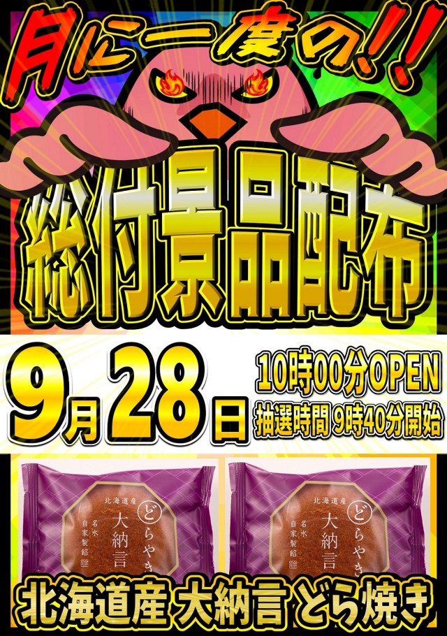 9月28日 月に一度の総付景品配布!朝10時開店!!!