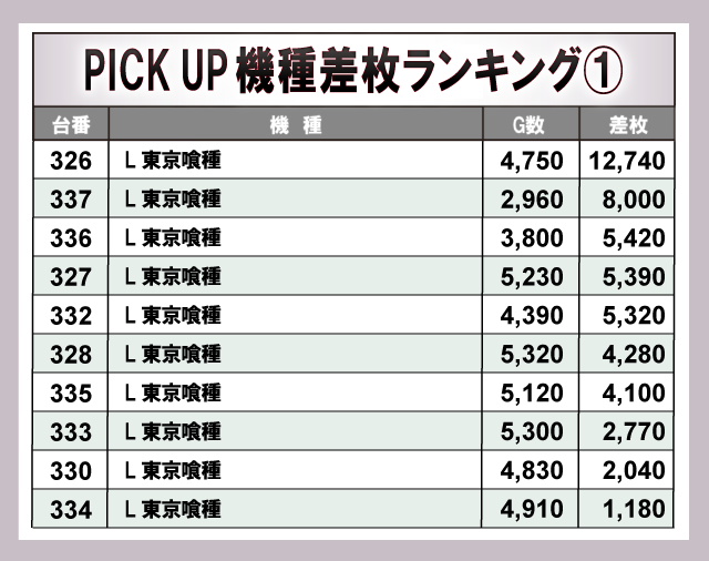 前述した『L 東京喰種』は優秀機種としてしっかりと活躍し、高い活気と熱気を放っていた事実が見て取れる。他にも 『沖ドキ!GOLD』『アイムジャグラーEX』といったメダル機も活躍しており、スペック問わず各所にチャンスは隠れていたようだ!