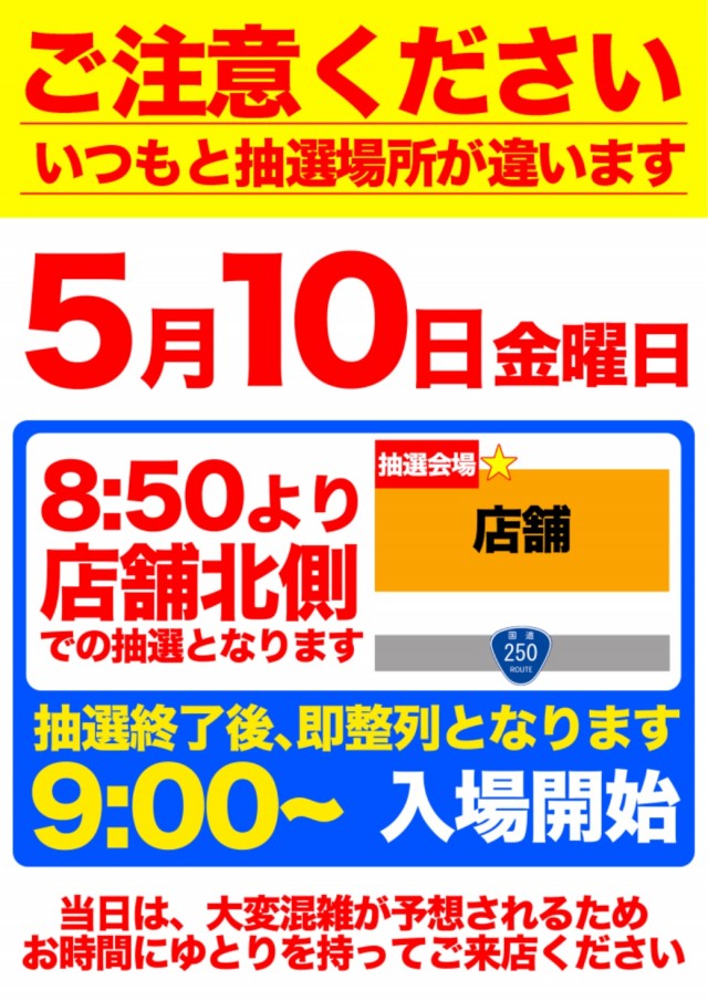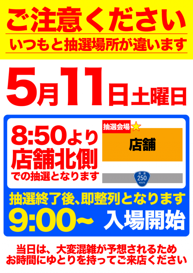 店舗にて8:55より抽選(変更がある場合は、別途ご案内いたします) |