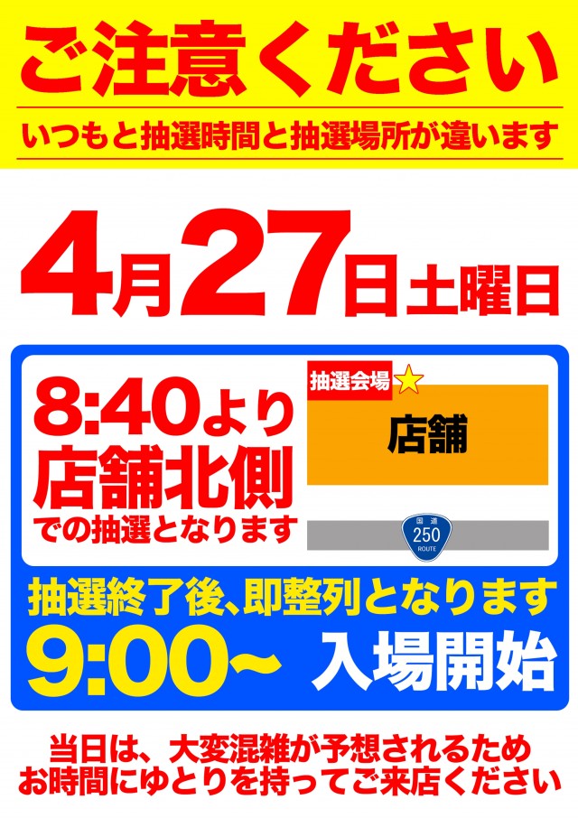 店舗にて8:55より抽選(変更がある場合は、別途ご案内いたします) |
