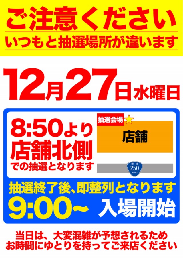 店舗にて8:55より抽選(変更がある場合は、別途ご案内いたします) |