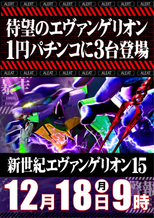 12月18日(月)朝9時開店!1円パチンコにエヴァ15登場!