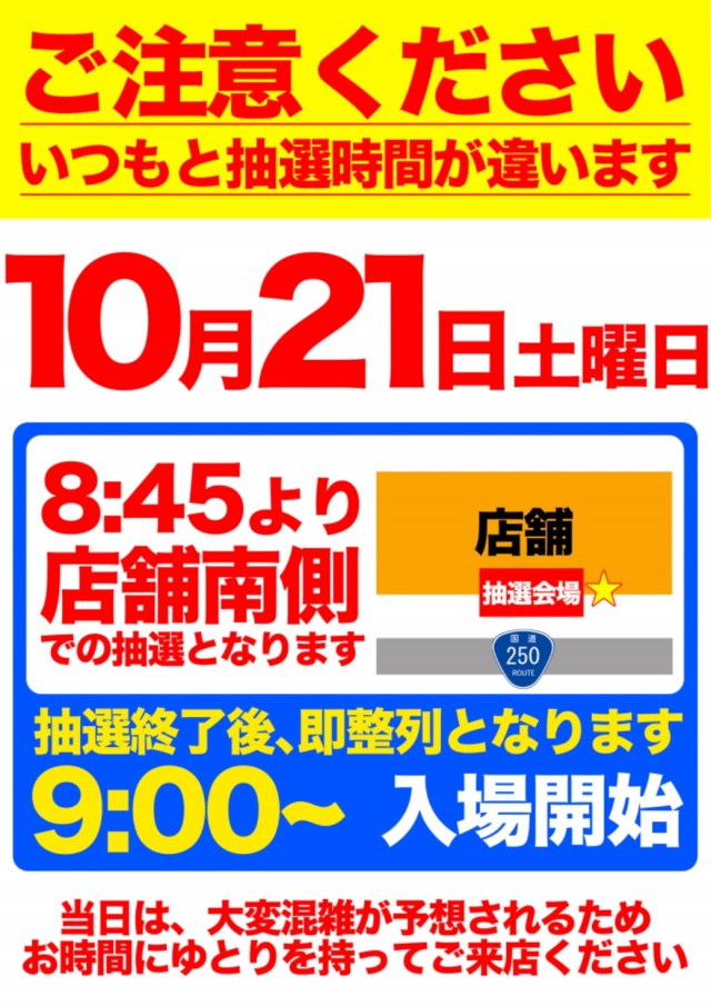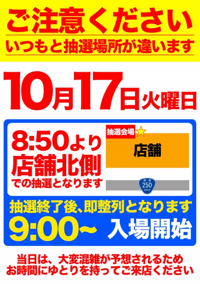 店舗にて8:55より抽選(変更がある場合は、別途ご案内いたします) |