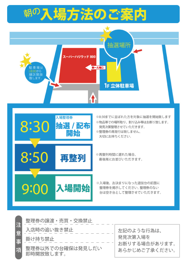 ☆朝の入場は抽選入場☆ 8:30~抽選開始 8:50~再整列 9:00~入場開始 |