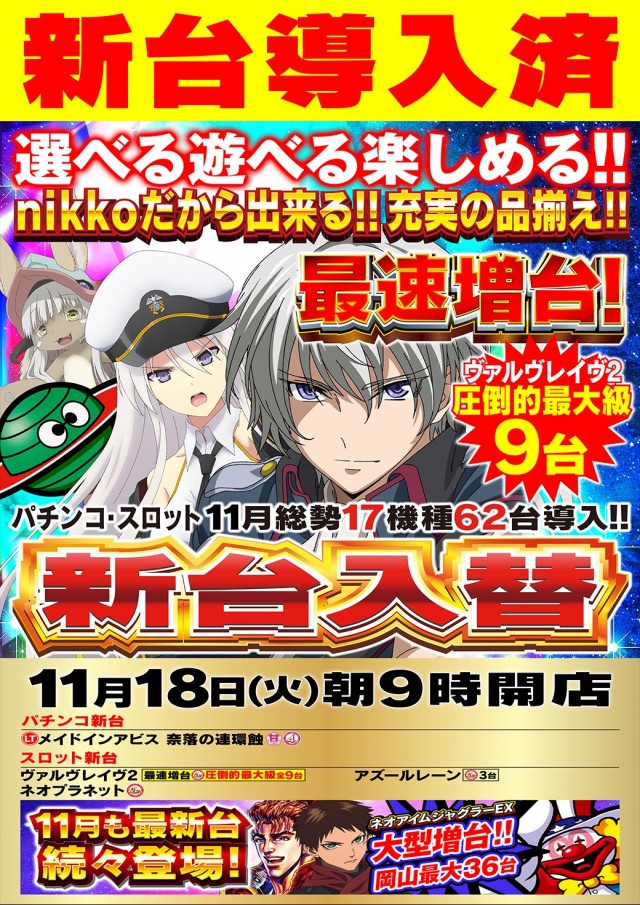 明日11月21日 新台入替完了!11月総勢17機種62台導入