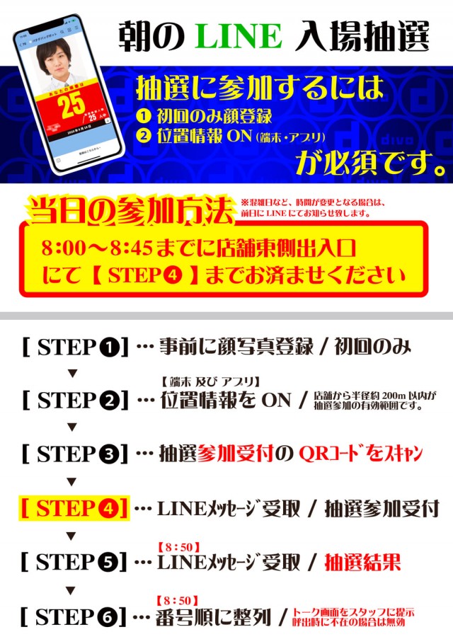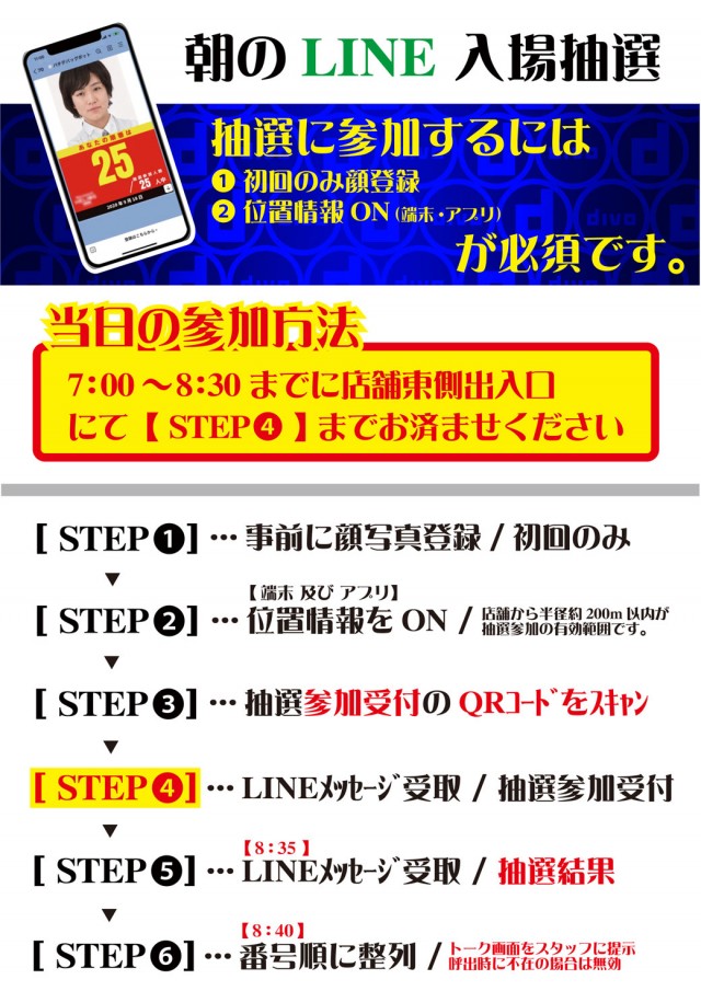 LINEオンライン抽選 【抽選受付時間・場所】 日時:8:00~8:45、8:00~8:30 場所:店舗内 【ご準備のお願い】スマートフォンとLINEアプリの位置情報取得を常時許可してください。 【抽選参加方法】店舗に設置されたQRコードを読み込み受付 |