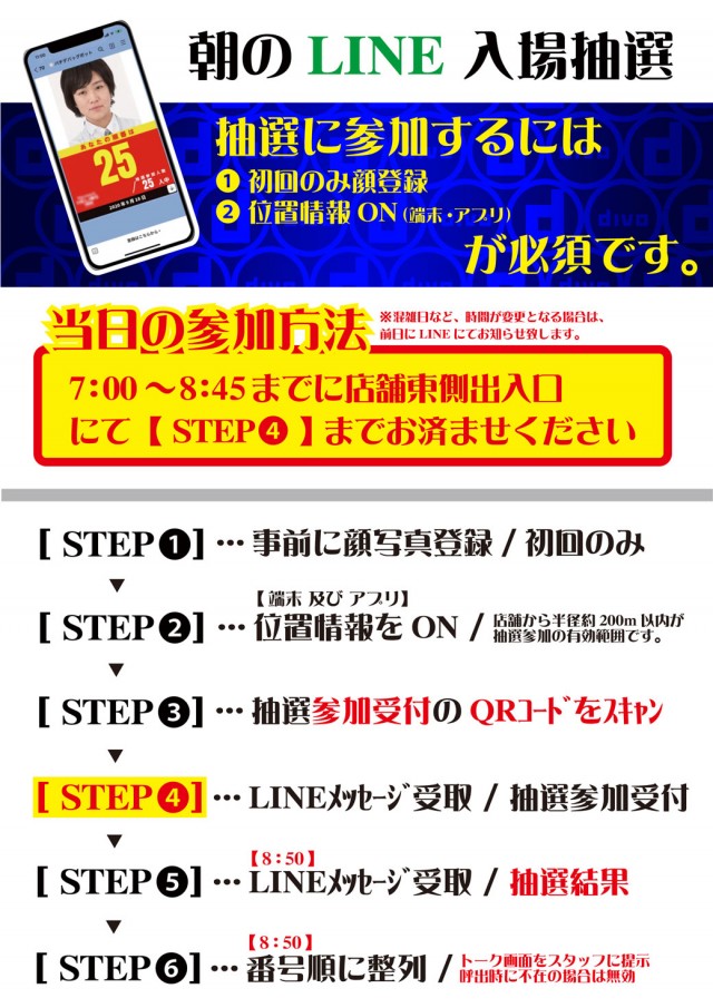 LINEオンライン抽選 【抽選受付時間・場所】 日時:8:00~8:45、7:00~8:30 場所:店舗内 【ご準備のお願い】スマートフォンとLINEアプリの位置情報取得を常時許可してください。 【抽選参加方法】店舗に設置されたQRコードを読み込み受付 |